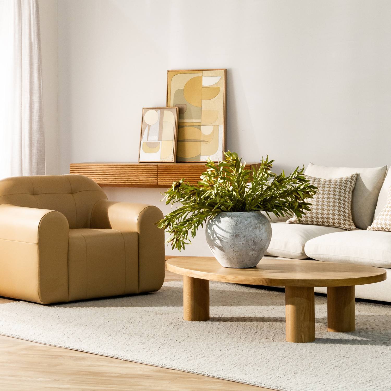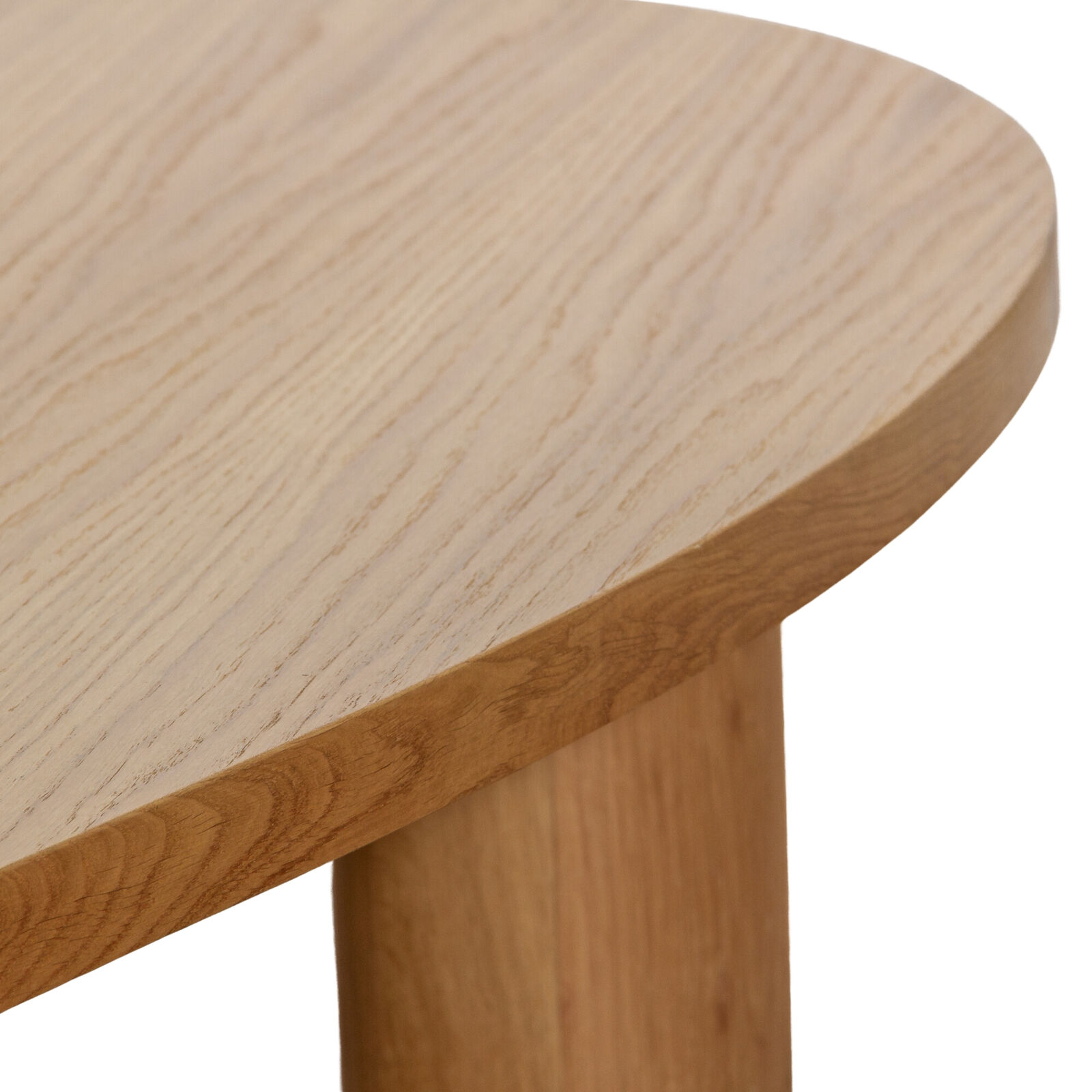 Our Adina Coffee Table features eclectic elegance and a sculptural design thanks to its simple details. This coffee table plays with minimalism in a new way with its sturdy legs in simple rounded detail. Finished in natural oak, this piece has a little texture as you run your hand over the grain.