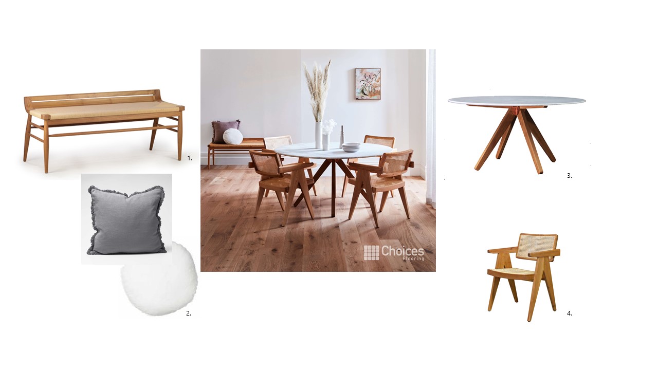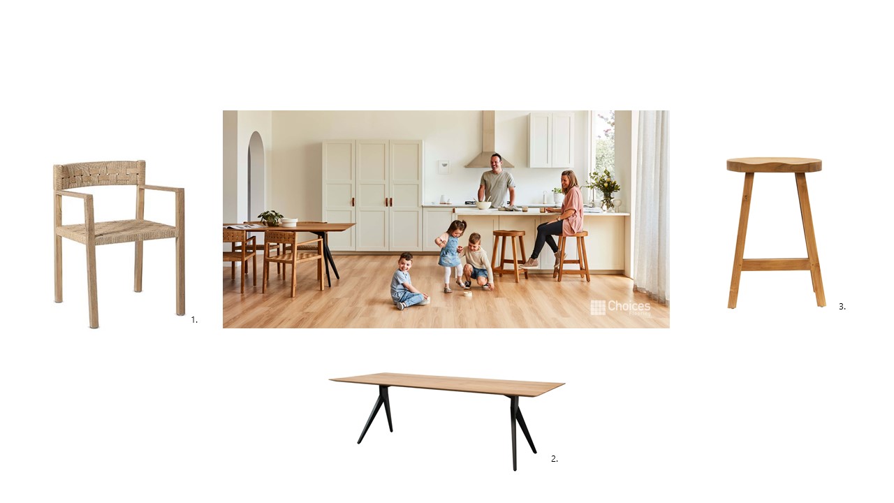 1. Logan Weave Armchair 2. Lucas Dining Table 3.Lucas Kitchen Stool