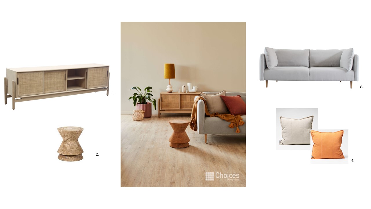 1. Alfa Sideboard, 2.Noah Divolo Stool, 3. Athena Sofa, 4. Luca Linen Cushions and Throw