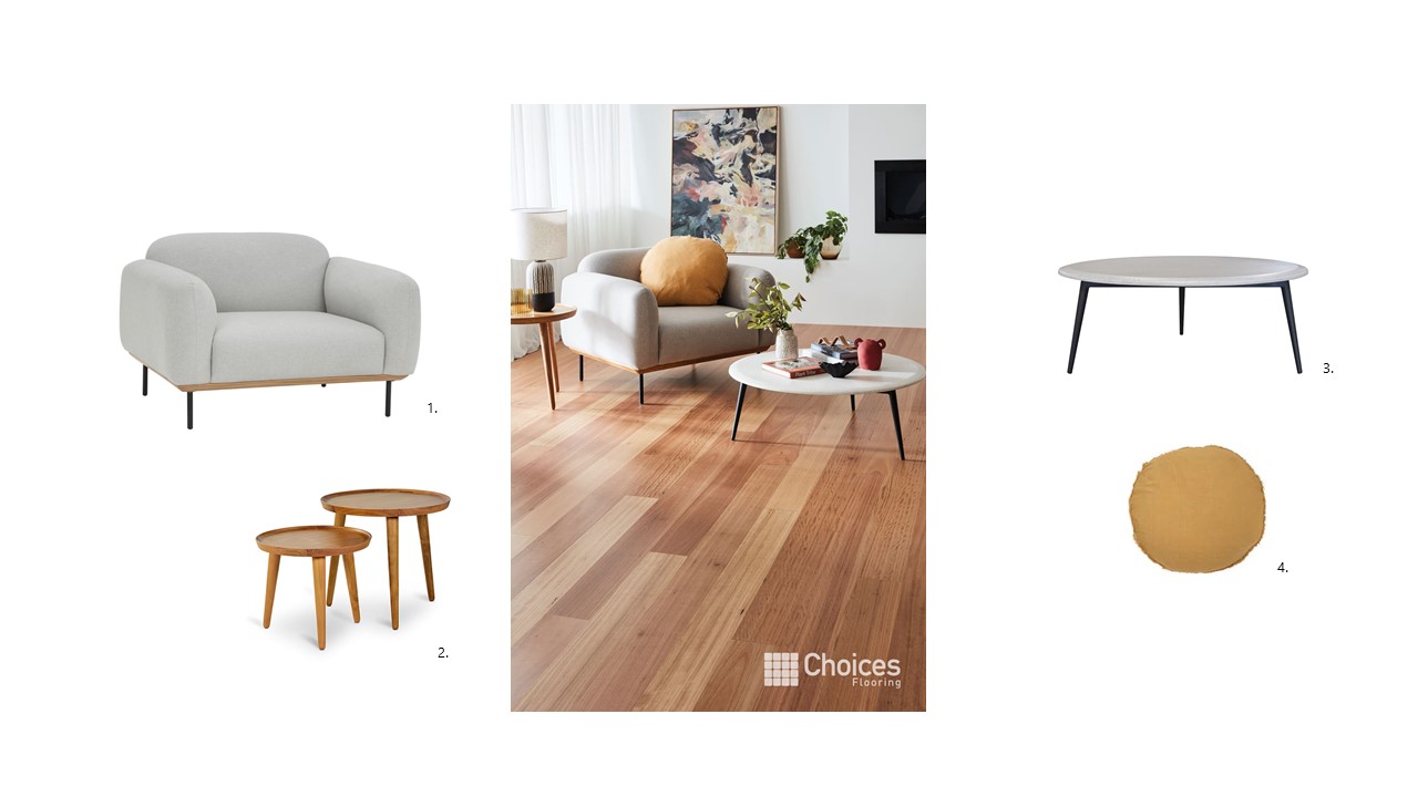 1. Marlese Lounge Chair, 2. Nordic Side Tables, 3. Tara Coffee Table, 4. Lulu Cushion