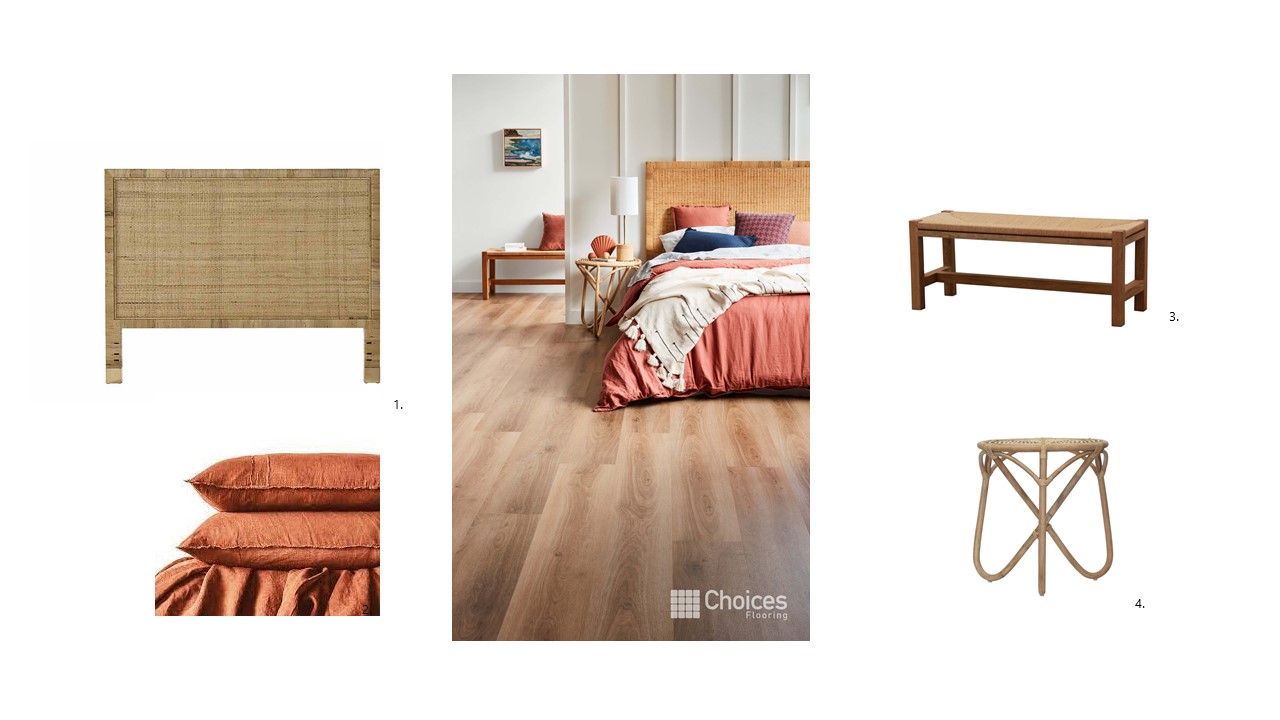 1.Anna Rattan Bedhead, 2.Tobacco Duvet Linen Set, 3. Lucas Bench, 4. Spoke Rattand Side Table