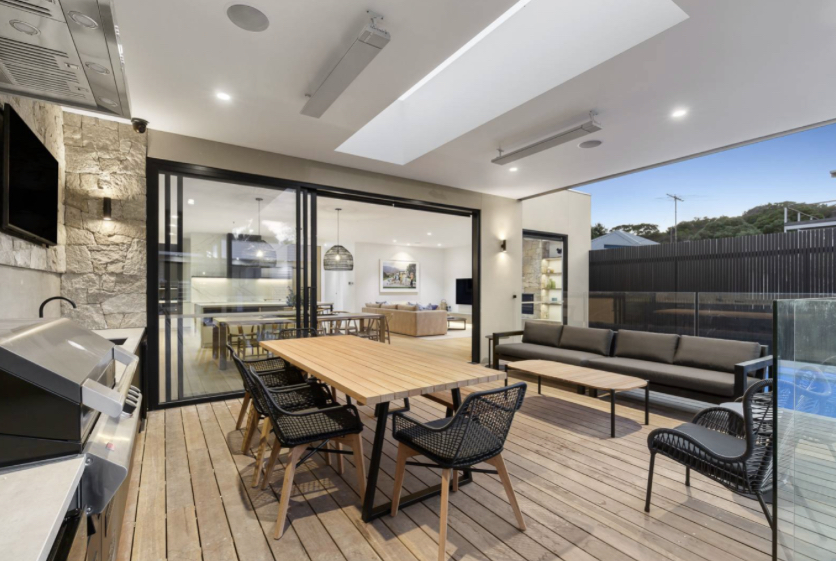 Maxum Dining Chairs, Vela Outdoor Table and Vela Bench Seat , Banyan Coffee Table