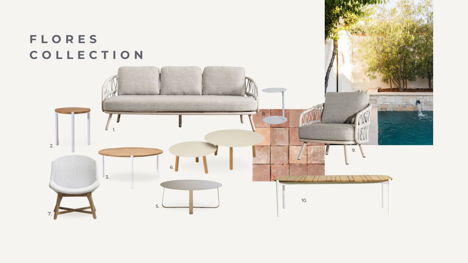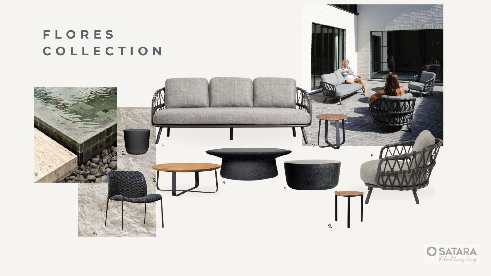 1. Flores Sofa 2. Banyan Side Table 3. Banyan Teak Top Coffee Table 5. Dena Coffee Table 6. Komo Coffee Table 7. Skal Lounge Chair 8. Samera Side Table 9. Flores Lounge Chair 10. Banyan Rectangle Coffee Table