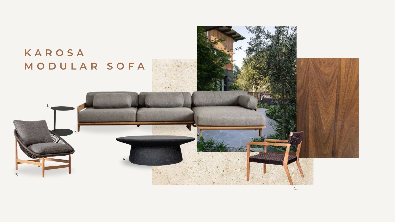 1. Samera Side Table 2. Karosa Modular Sofa 3. Matera Lounge Chair 4. Norfolk Plinth Coffee Table 5. Ithaka Rope Lounge Chair