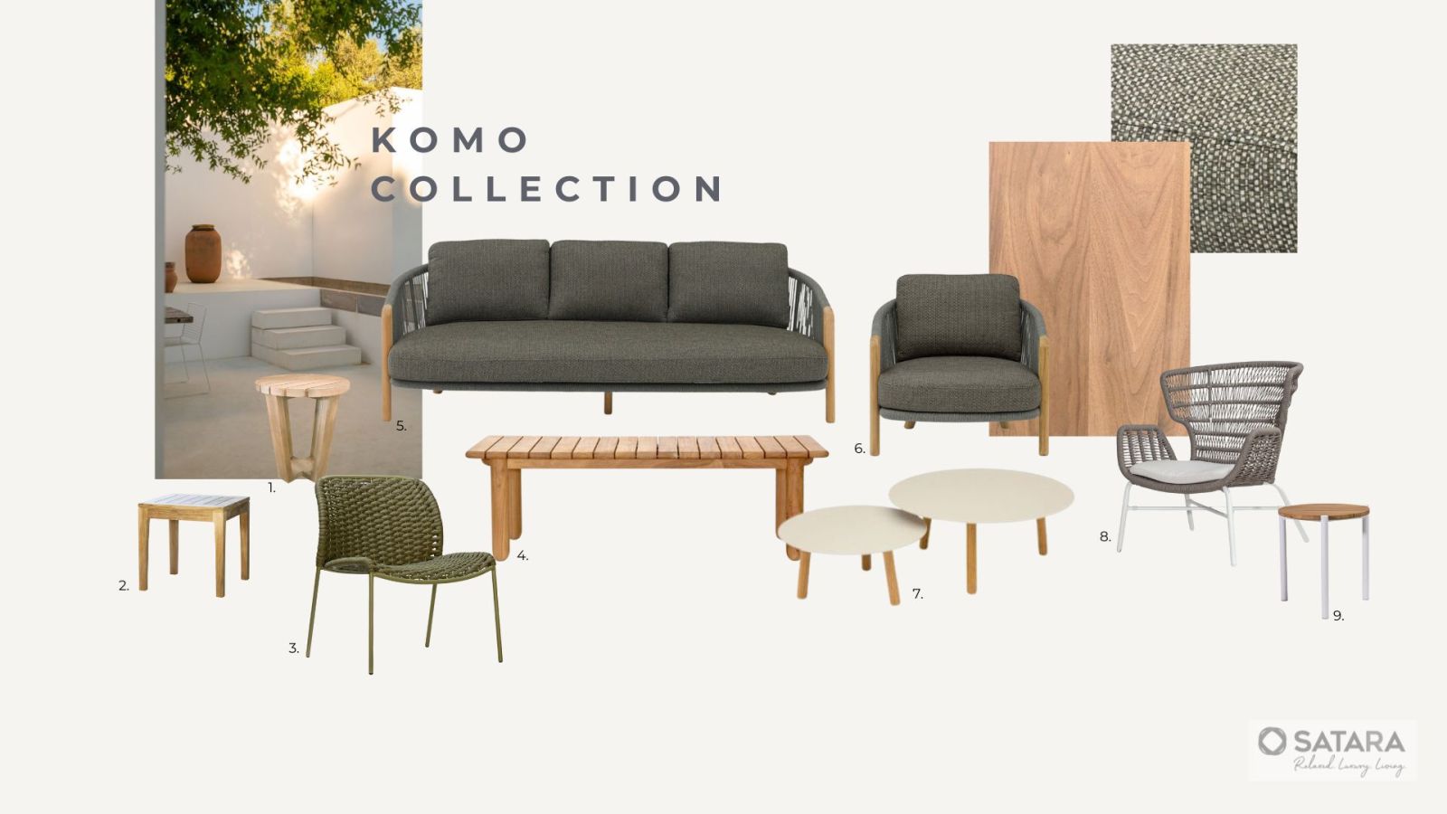 1. Skal Round Side Table 2. Bedarra Side Table 3. Roca Lounge Chair 4. Paros Coffee Table 5. Komo Sofa 6. Komo Lounge Chair 7. Komo Coffee Table 8. Tiah Cocoon Hi-back Lounge Chair 9. Banyan Teak Side Table