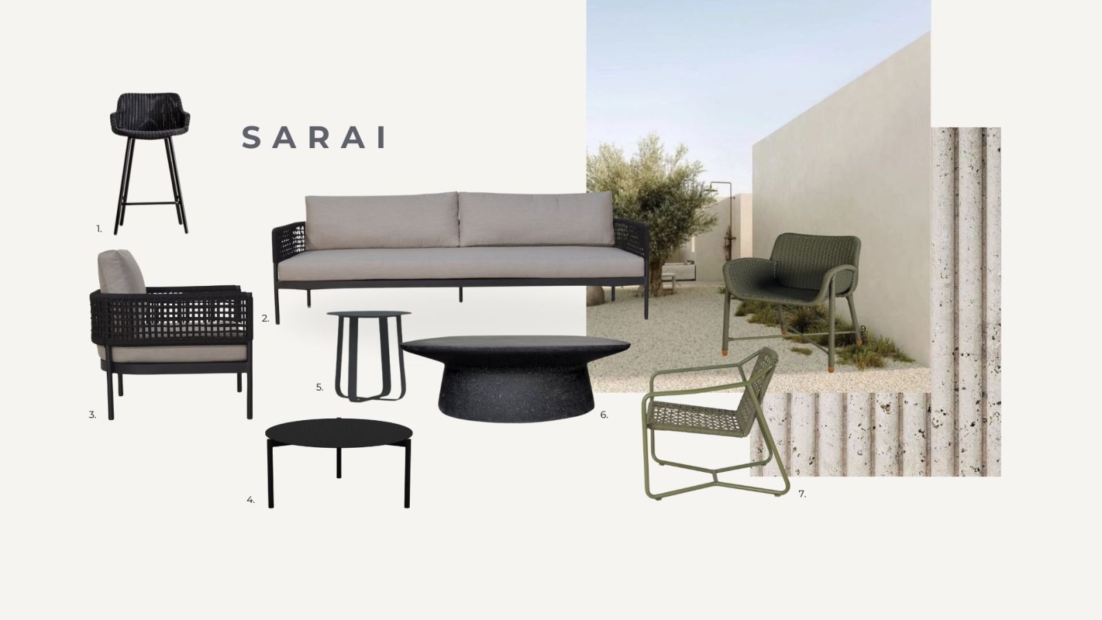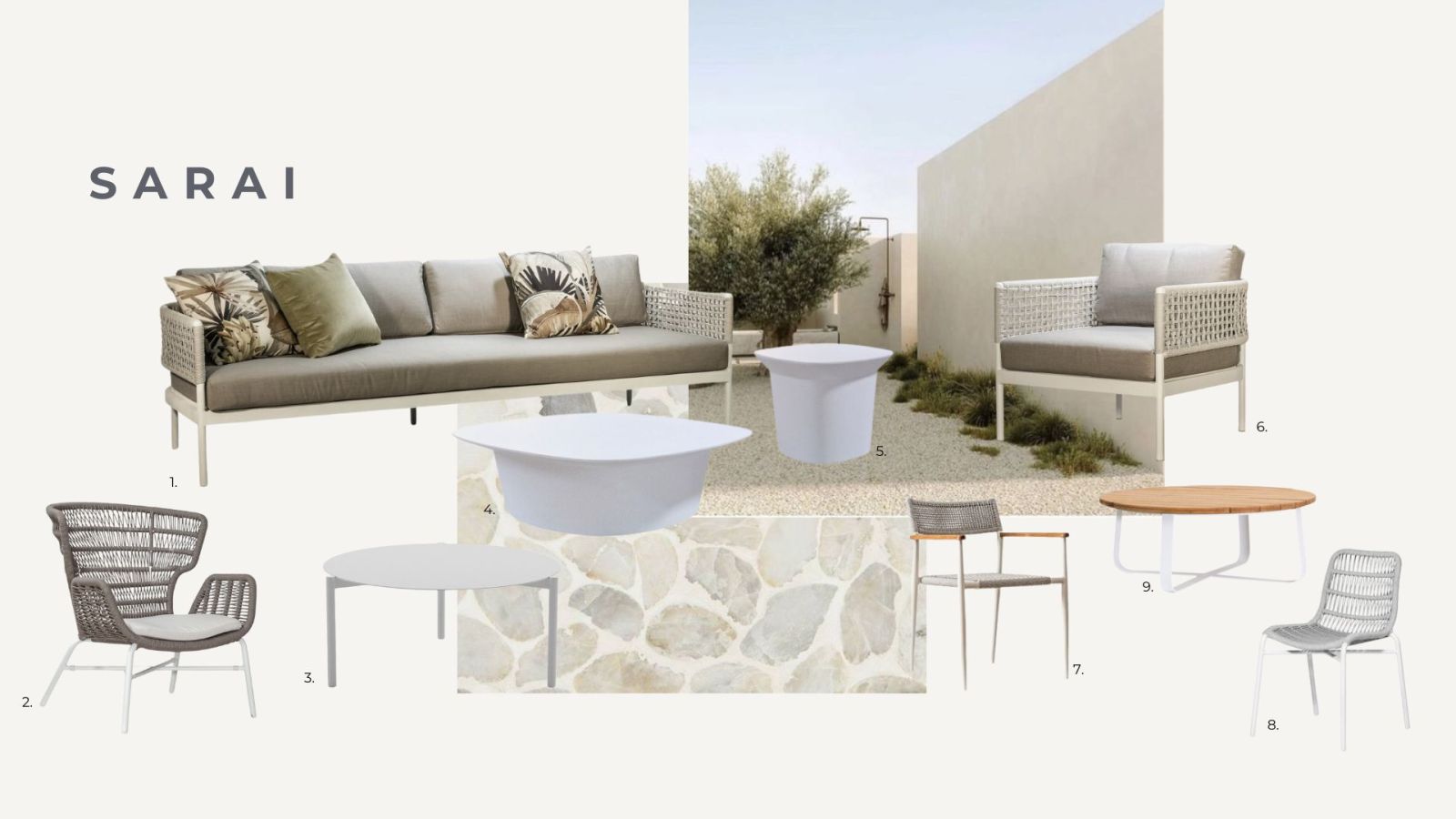 1. Skal Bar Stool - Alu 2. Sarai Sofa 3. Sarai Lounge Chair 4. Banyan Coffee Table 5. Dena Side Table 6. Norfolk Plinth Coffee Table 7. Dockside Lounge Chair 8. Rain Lounge Chair
