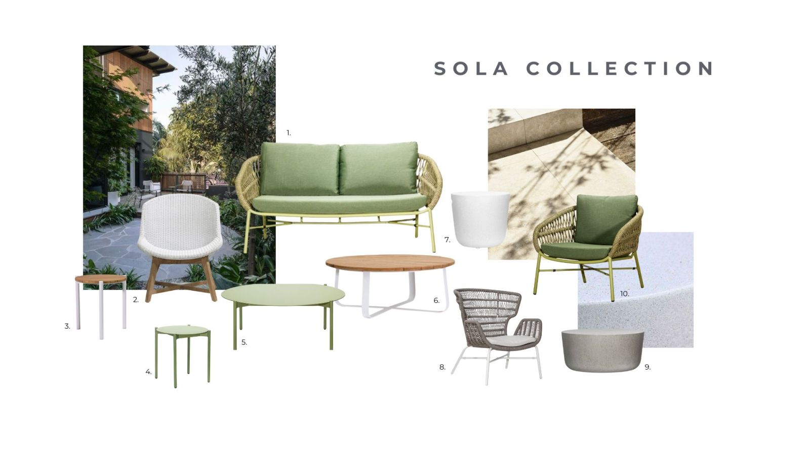 1. Sola 2 Seater Sofa 2. Skal Lounge Chair 3. Banyan Teak Side Table 4. Heron Side Table 5. Heron Coffee Table 6. Dena Teak Top Coffee Table 7. Curve Side Table 8. Tiah Cocoon Hi-Back Lounge Chair 9. Curve Coffee Table 10. Sola Lounge Chair