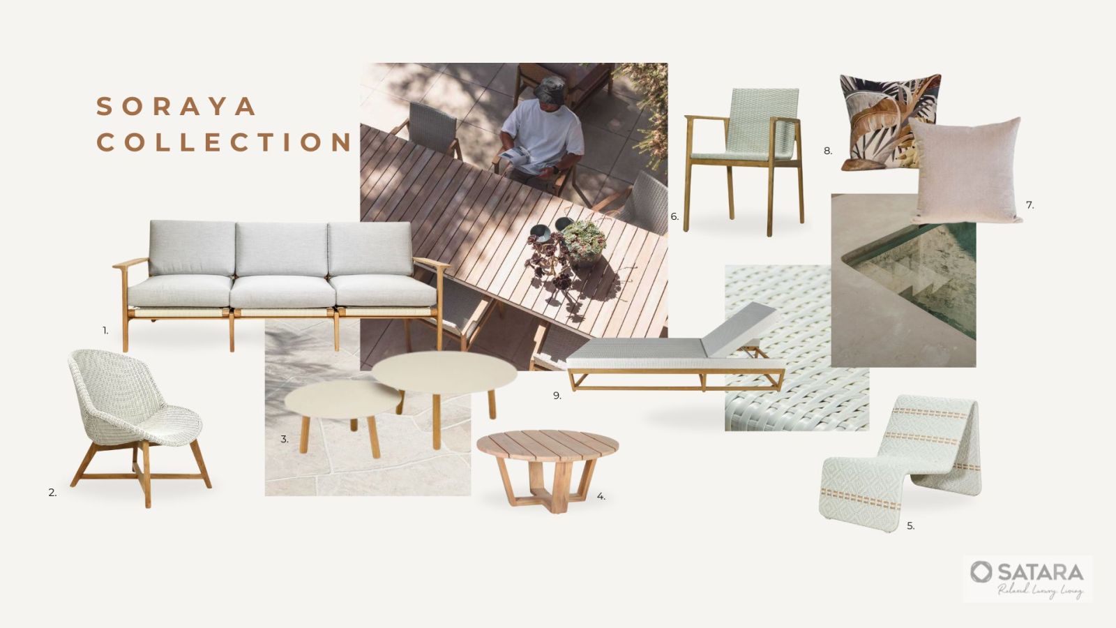 1. Soraya Sofa 2. Skal Lounge Chair 3. Komo Coffee Table (High & Low) 4. Skal Coffee Table 5. Kanye Lounge Chair 6. Soraya Armchair 7. South Beach Sand Cushions 8. Tropica Gilver Cushion