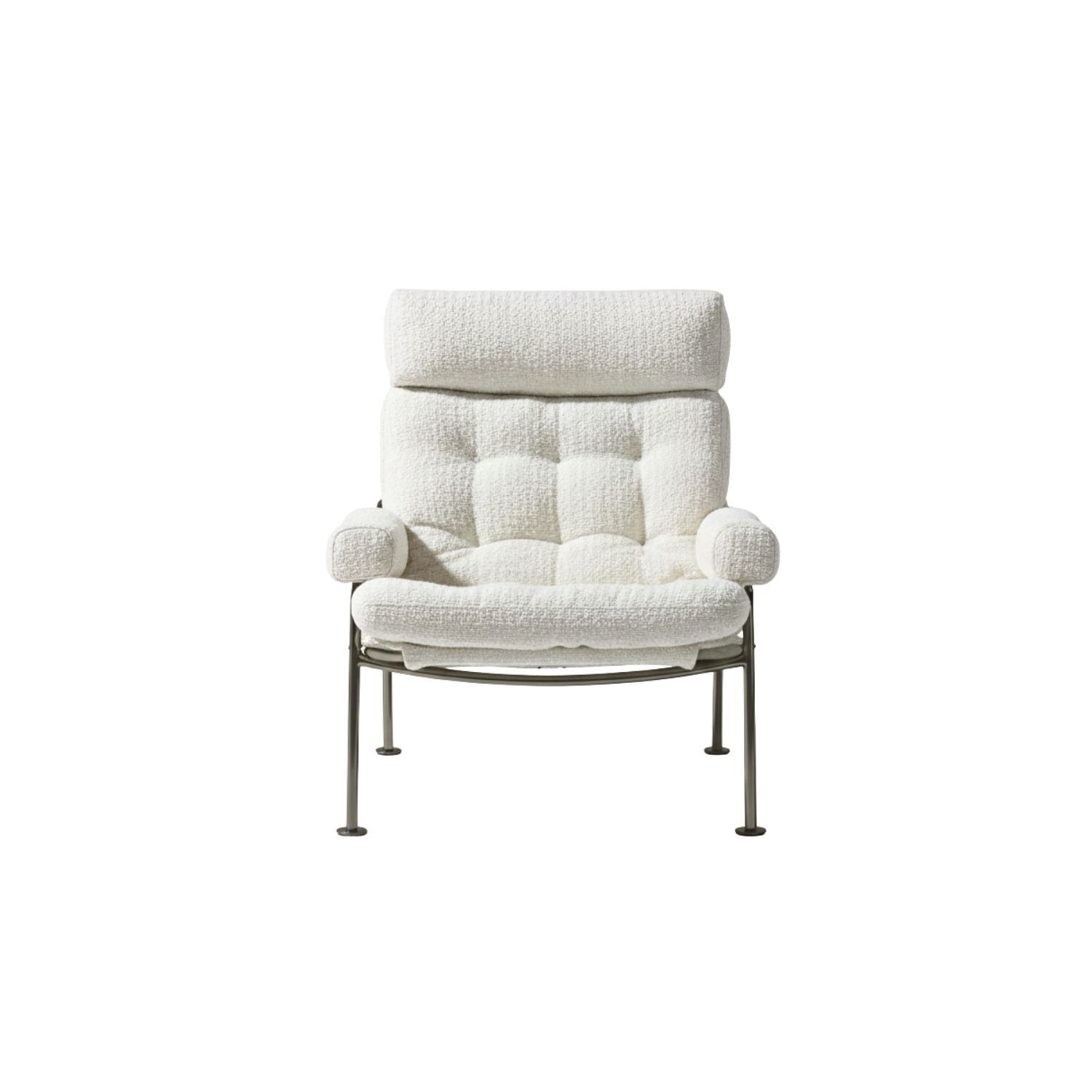 Designed to be lived in, the Brando Occasional Chair pairs plush tufted boucle with a refined open steel frame for a look that feels as good as it sits. The softness of the fabric set against the lean lines of the metal lending the chair a balance that is both tactile and visually considered. The high back and integrated headrest invite you to settle in fully, while the open frame keeps the silhouette light and unimposing. A chair for the interior that values both feeling and form.