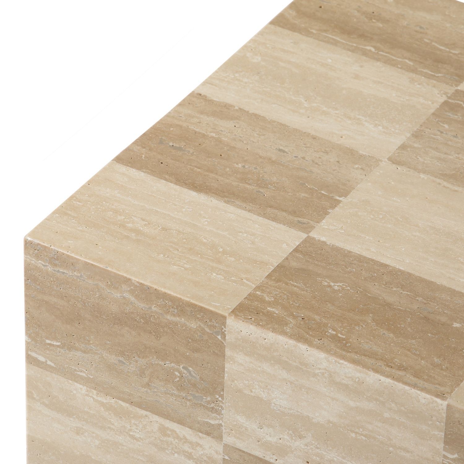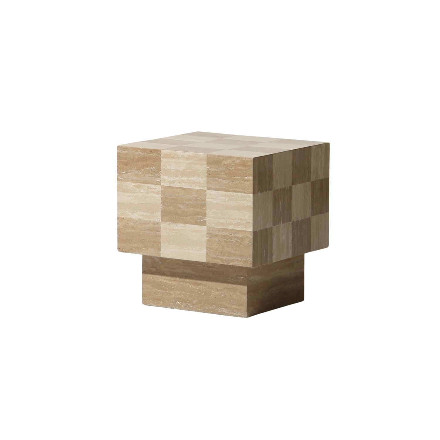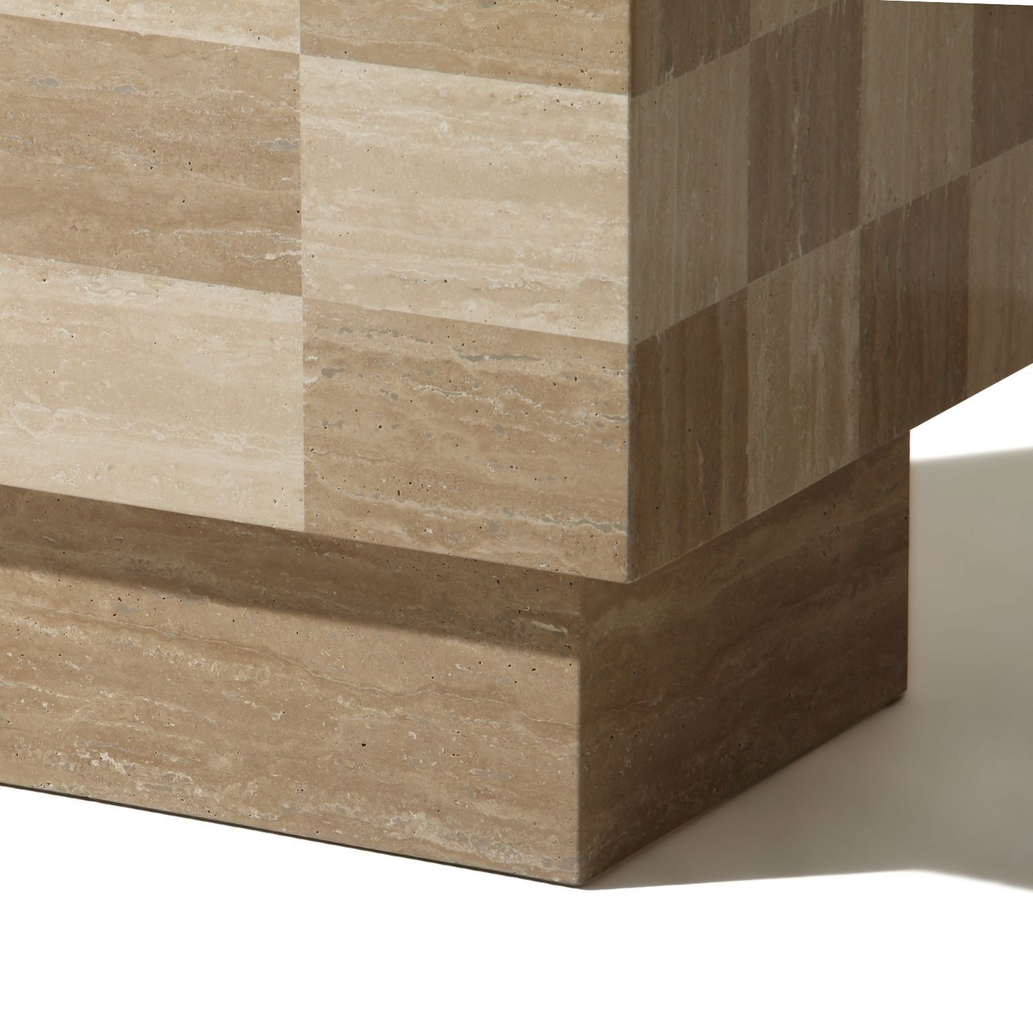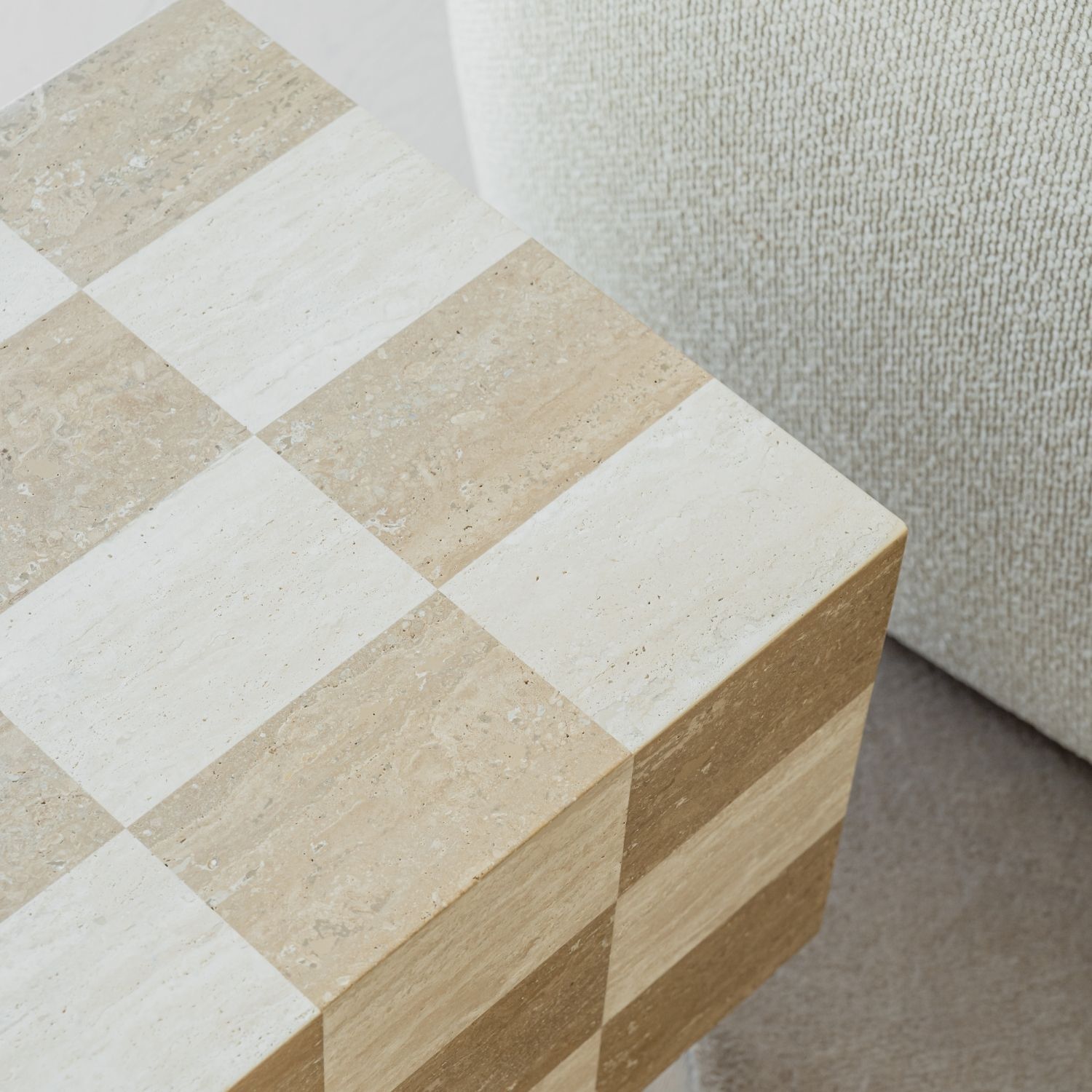 The Checkmate Side Table embraces bold, contemporary design, combining art and function in a way that transforms any space. Crafted from travertine and applied in a striking checkered pattern, this square cube brings a sense of playful luxury to the room. The subtle veining and natural variations in the stone create a dynamic surface, making each piece unique while adding texture and depth to your interior. Perfect for those with an eye for eclectic design, this side table exudes confidence with its geometric shape and modern finish. Whether you're outfitting a stylish urban apartment, refreshing a commercial space, or completing a home renovation, the Checkmate Side Table serves as both a statement piece and a versatile accent, ready to complement a variety of styles. Let it anchor your space with its commanding presence, offering both form and function for the modern, design-savvy individual.