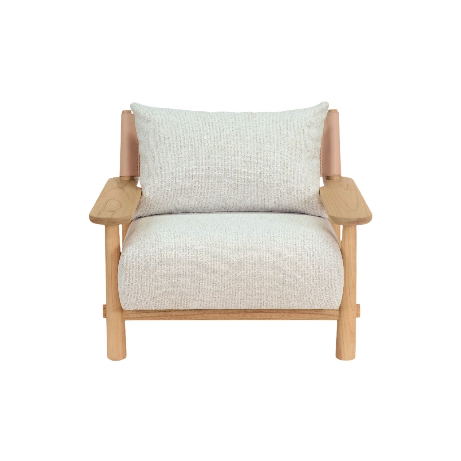 The sturdy oak frame, finished with smooth, rounded edges, adds natural warmth and a minimalist aesthetic that complements modern and Scandinavian-inspired interiors. With its wide proportions, slanted backrest, and supportive armrests, the Coju Lounge Chair adds an elegent touch to any living, bedroom or office space.