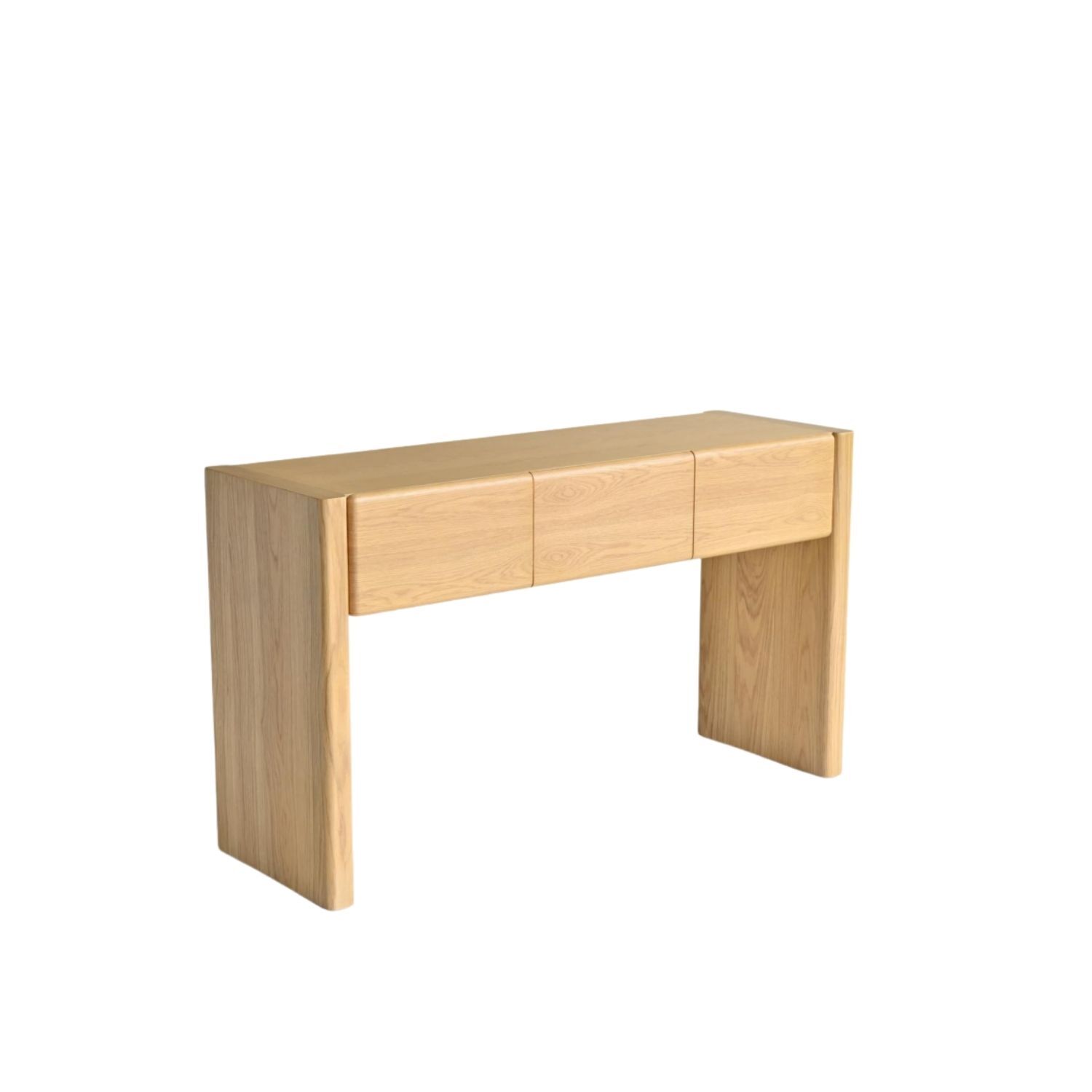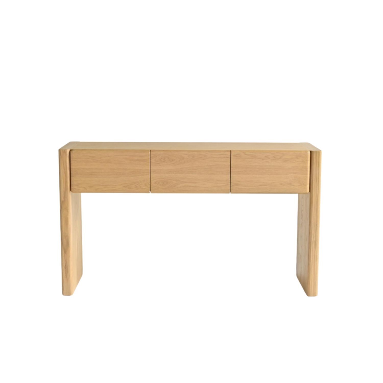 The Hayden Console is built in timber with a strong architectural profile defined by solid side panels and a floating drawer volume. Three drawers sit seamlessly within the frame, keeping the surface uninterrupted and functional. The timber grain carries through the form, giving warmth and durability suited to everyday use. Positioned in an entry or living space, it holds keys, objects and daily pieces with ease while maintaining a calm visual presence.