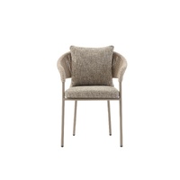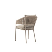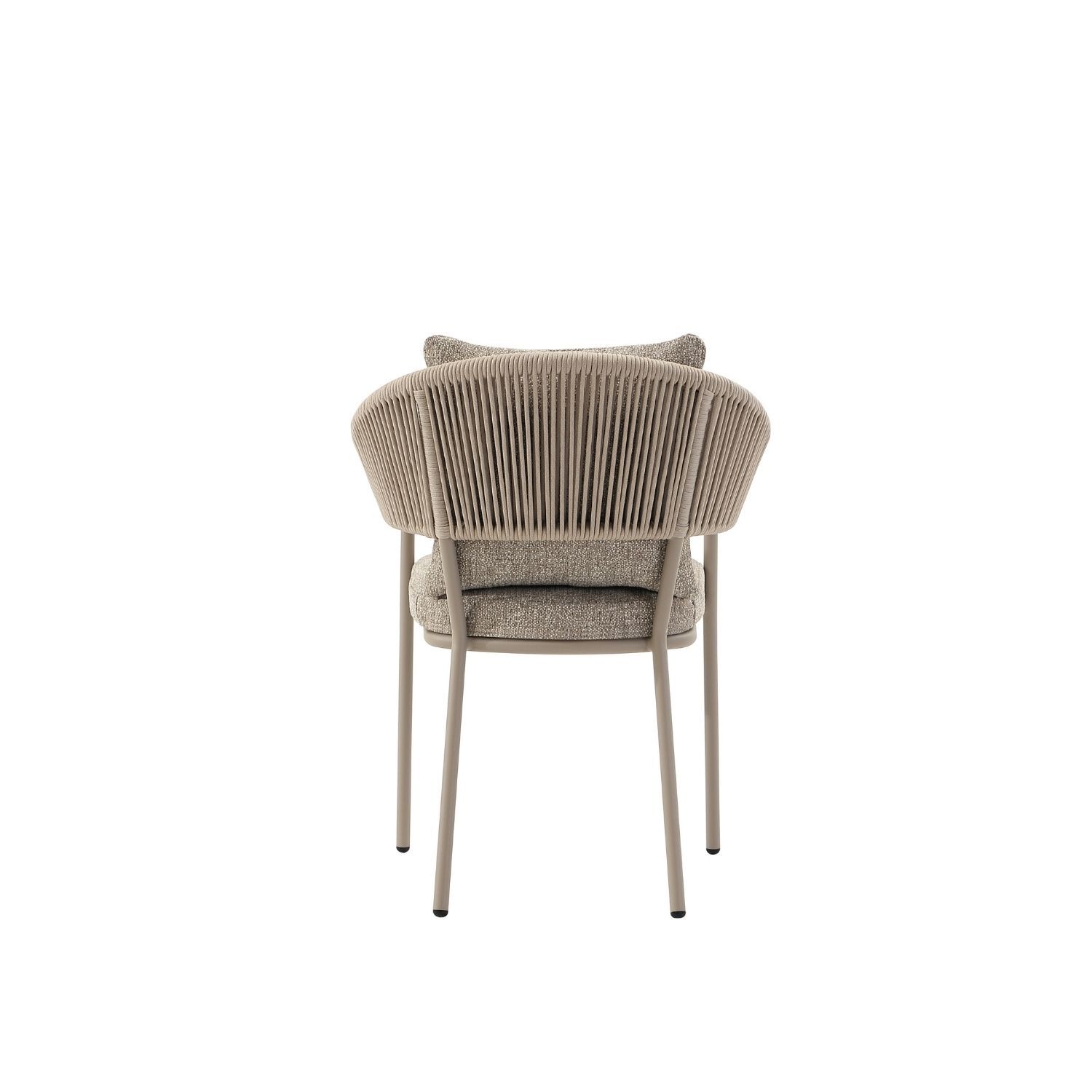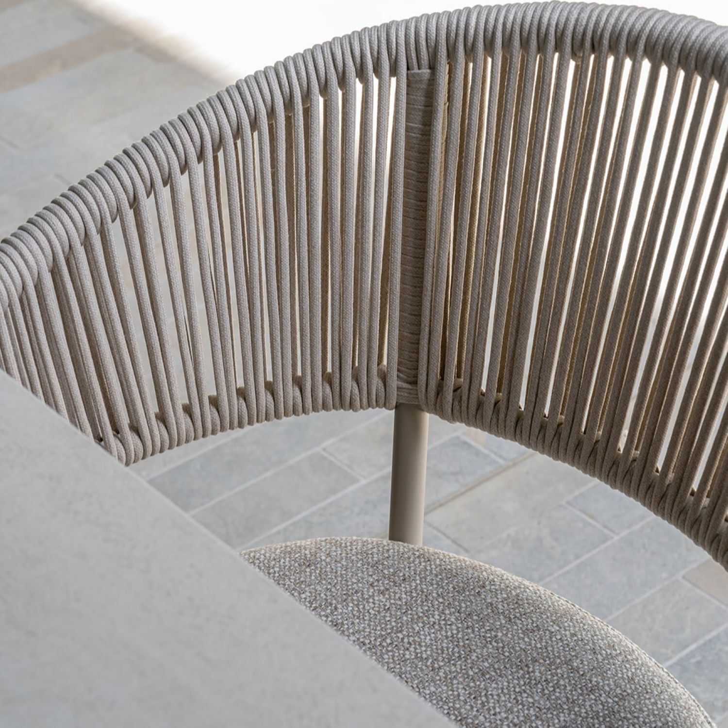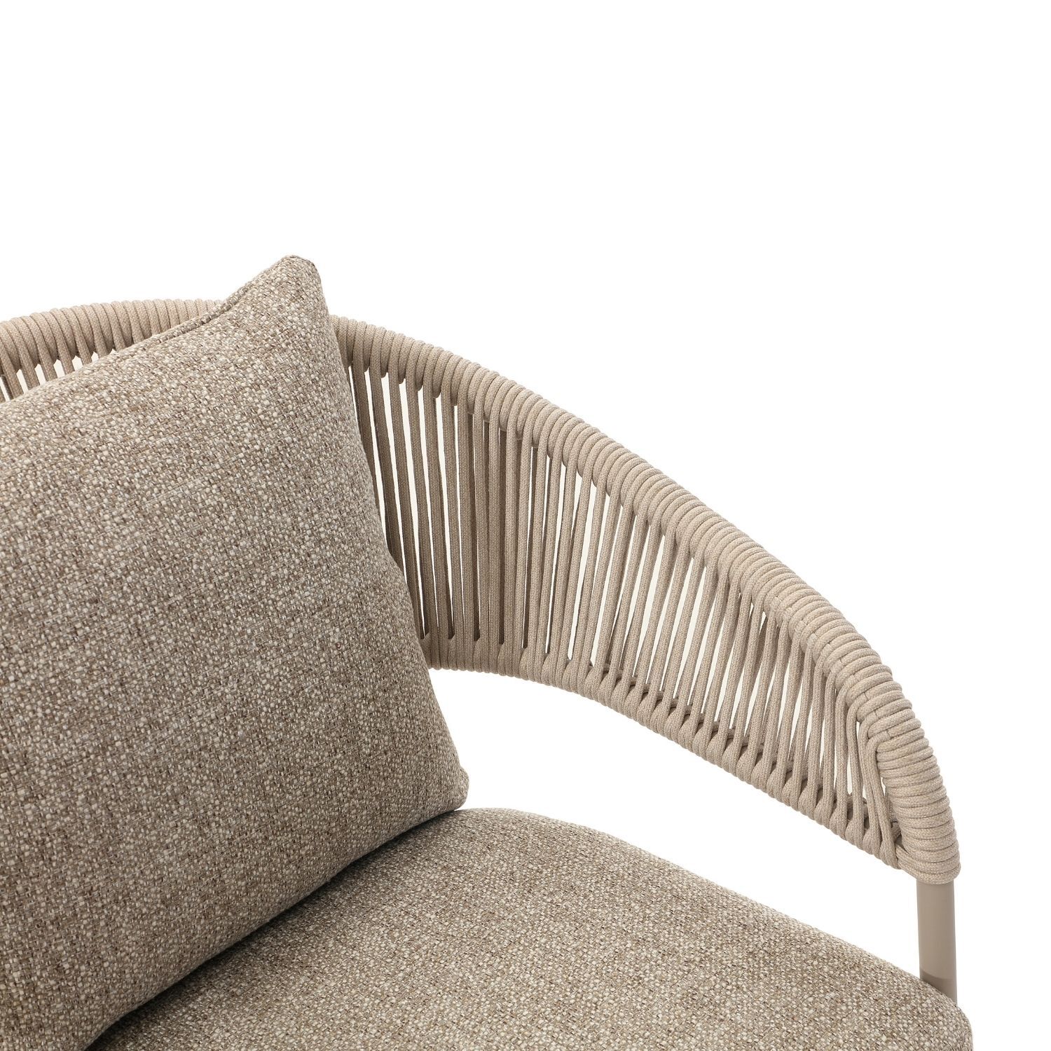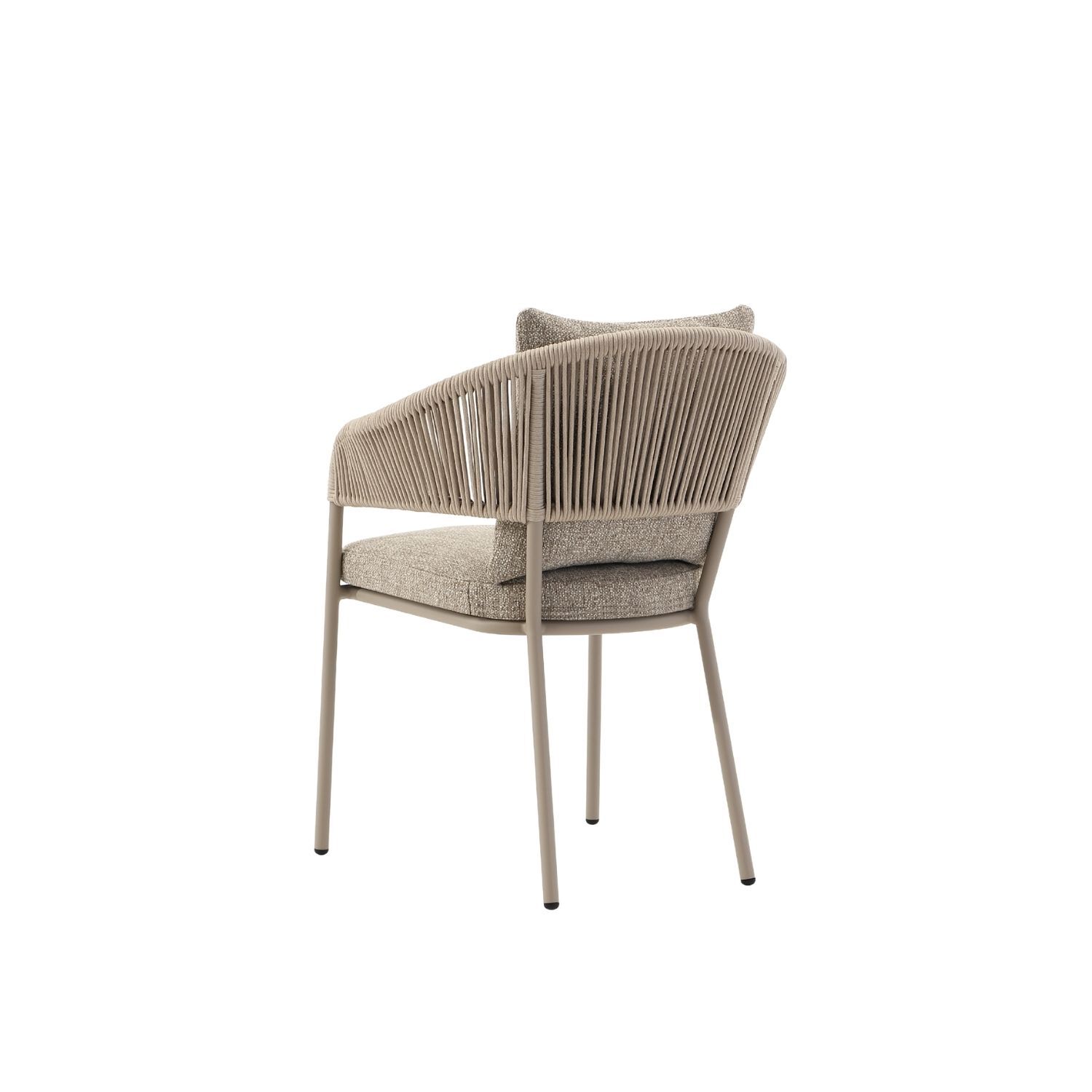 The Isola Armchair brings a quiet elegance to outdoor dining, a piece where contemporary form meets with effortless ease. The handwoven rope back and arms flow in tightly wrapped vertical lines, creating an open, breathable structure that feels organic in the outdoors while delivering genuine back support. The softly contoured arms curve and taper in a way that moulds naturally to the body. A plush upholstered seat cushion and soft back cushion complete the experience,  comfortable enough to linger over a long lunch, durable enough to weather every season with ease.