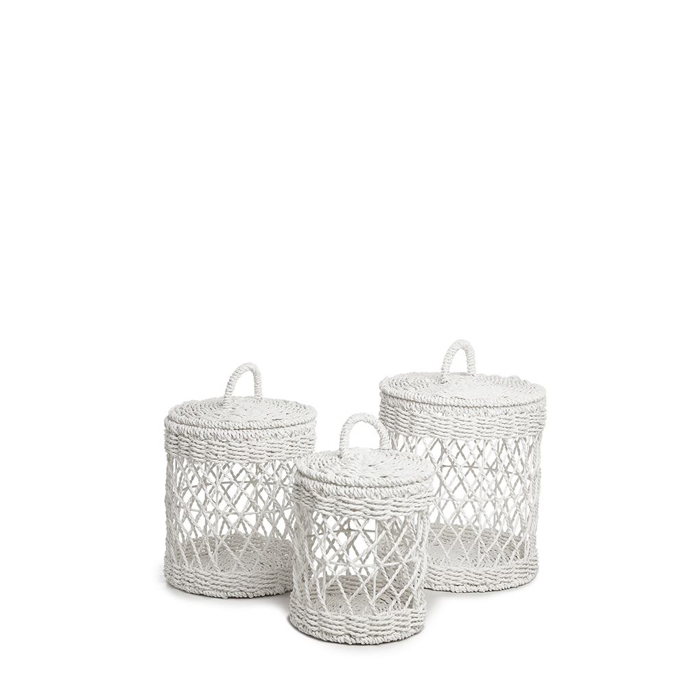 The Ketba Baskets are made from handwoven water hyacinth. They feature an open netting design with lids. Great to use around the home for storage or decoration.