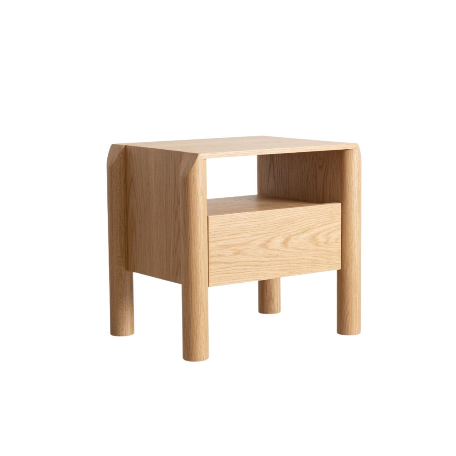 The Marly Bedside Table is crafted from timber, highlighting its natural grain and texture. Its simple form and round legs that taper at the top give it a refined architectural touch. A single drawer offers practical storage without interrupting the clean lines of the design. Ideal for the bedroom, the Marly Bedside Table brings a light, organised presence while keeping essentials within easy reach.