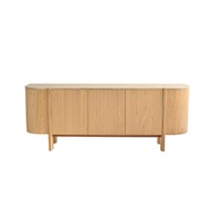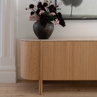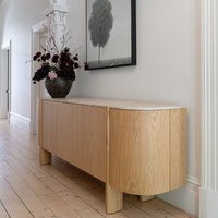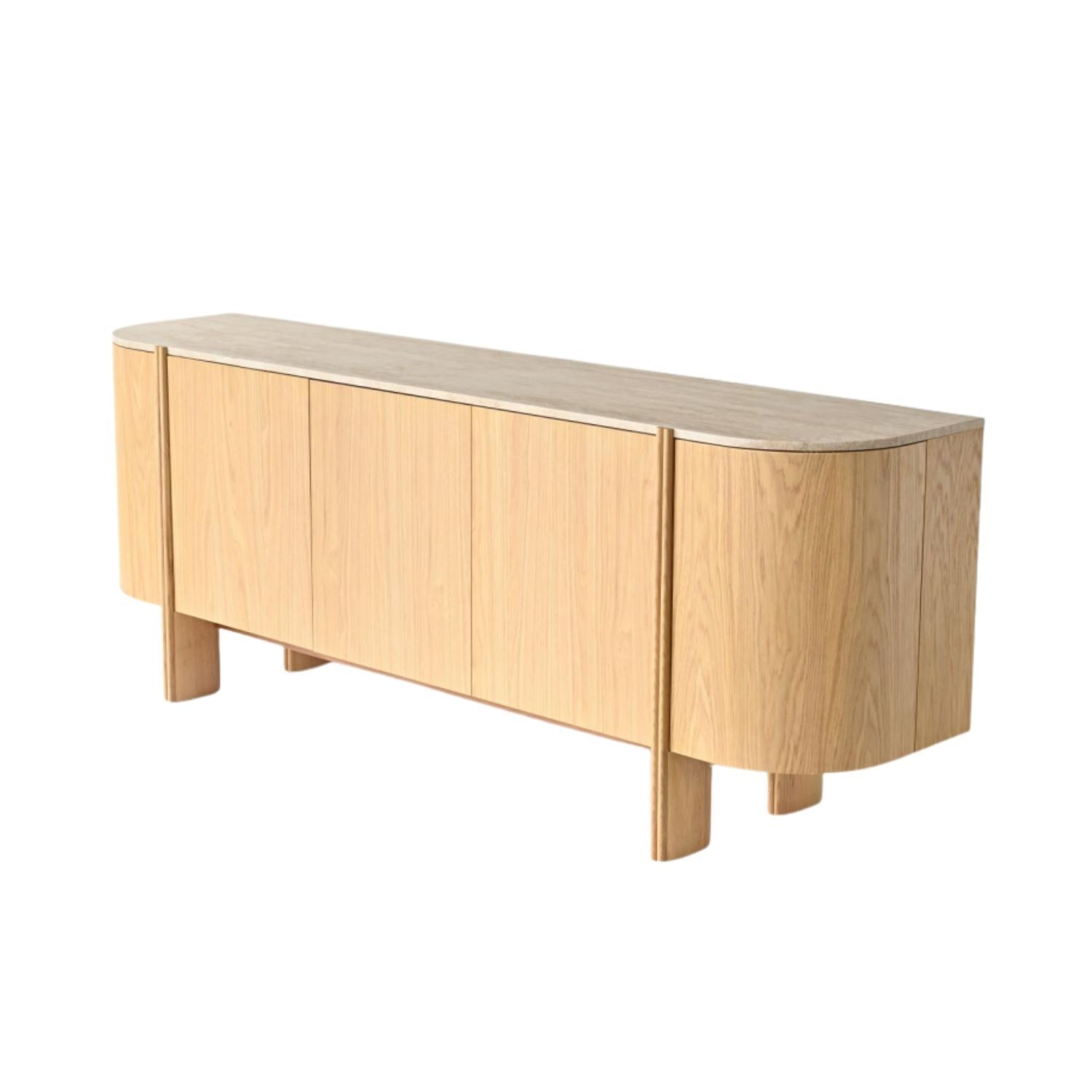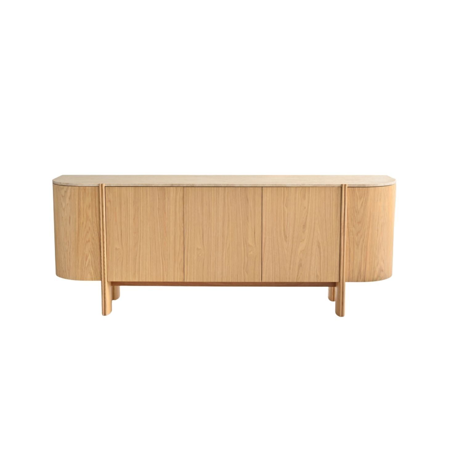 The Maverick Sideboard embraces a sculptural presence, bringing a sense of calm structure to the dining or living space. Crafted in oak, its softly rounded ends introduce an organic silhouette, while a beige travertine marble top adds a subtle touch of luxury and tactile contrast. A simple raised base gives the piece a light, grounded feel. Three flush, handle-free doors sit neatly at the centre, framed by slender rounded pillars that create subtle rhythm across the façade. Maverick offers generous concealed storage while maintaining a quiet, architectural presence suited to contemporary interiors.