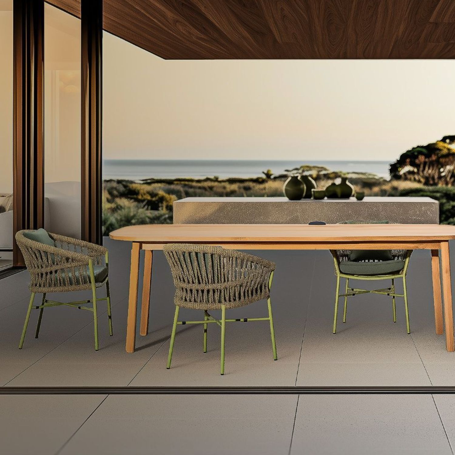 Crafted with precision, the Mila Outdoor Dining Chair boasts a stream lined white aluminum frame that not only adds a contemporary touch but also ensures sturdiness and resistance to the elements. The chair's open weave textured rope back and sides provide a captivating design element, adding an eye-catching and inviting look to your outdoor space.
