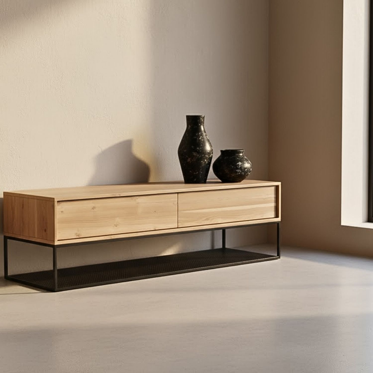 The Noah TV Unit epitomizes modern elegance with its sleek and minimalist design, showcasing a metal base and a reclaimed teak case for a touch of rustic charm. Offering practicality along with style, it comes equipped with two drawers and an open metal shelf.