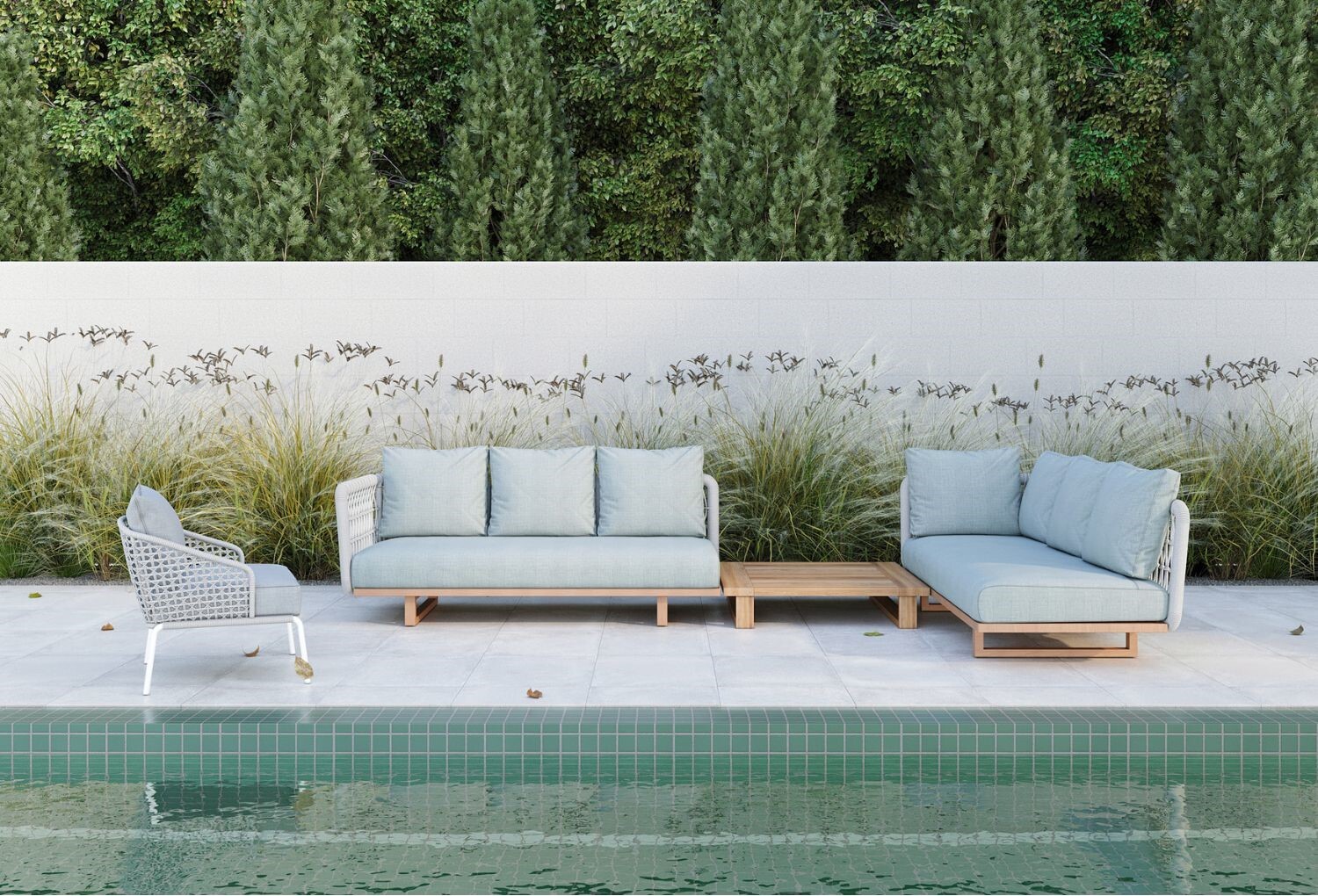 Introducing the new Norfolk Chaise in our latest Diamond Rope design. Crafted with durable teak legs and adorned with Sunbrella upholstery, this Chaise offers unrivaled comfort and style. With its customisable Sunbrella and rope options, this multi-functional piece allows you to effortlessly shape your space with elegance and versatility.