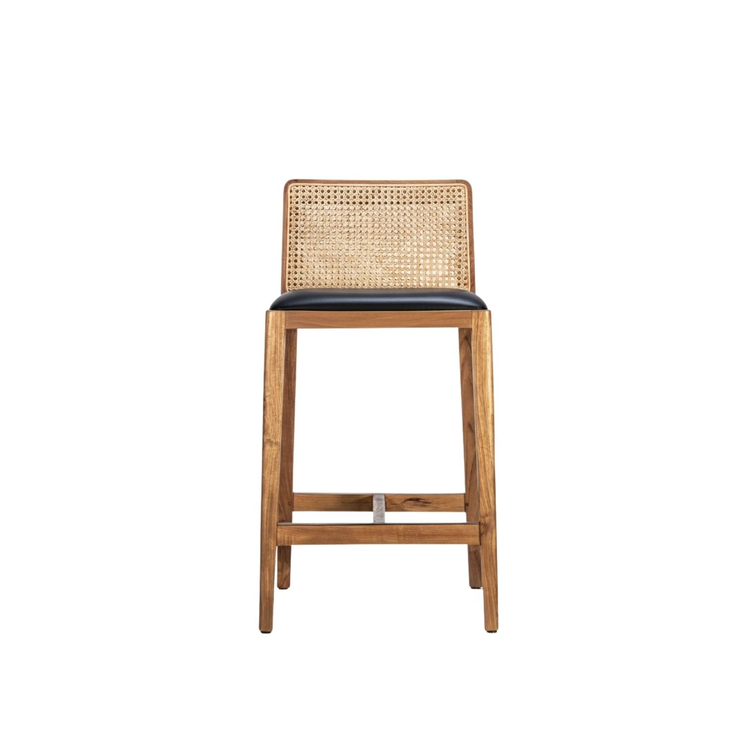 The Pocket Bar Stool seamlessly blends coastal style with natural elements, making it a standout addition to any kitchen counter or bar area. Crafted from raw teak with a soothing natural finish, this bar stool combines comfort and style, ideal for mornings or evenings spent at home. Built with high-quality materials, it embodies elegant simplicity that integrates effortlessly into a variety of interior décors. Its robust construction ensures long-lasting durability, while thoughtful design offers a welcoming spot to relax. The aesthetic charm is elevated by a rattan woven back, providing both support and a touch of design flair, complemented by a comfortable vegan leather seat for the perfect balance of comfort and sophistication.