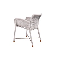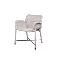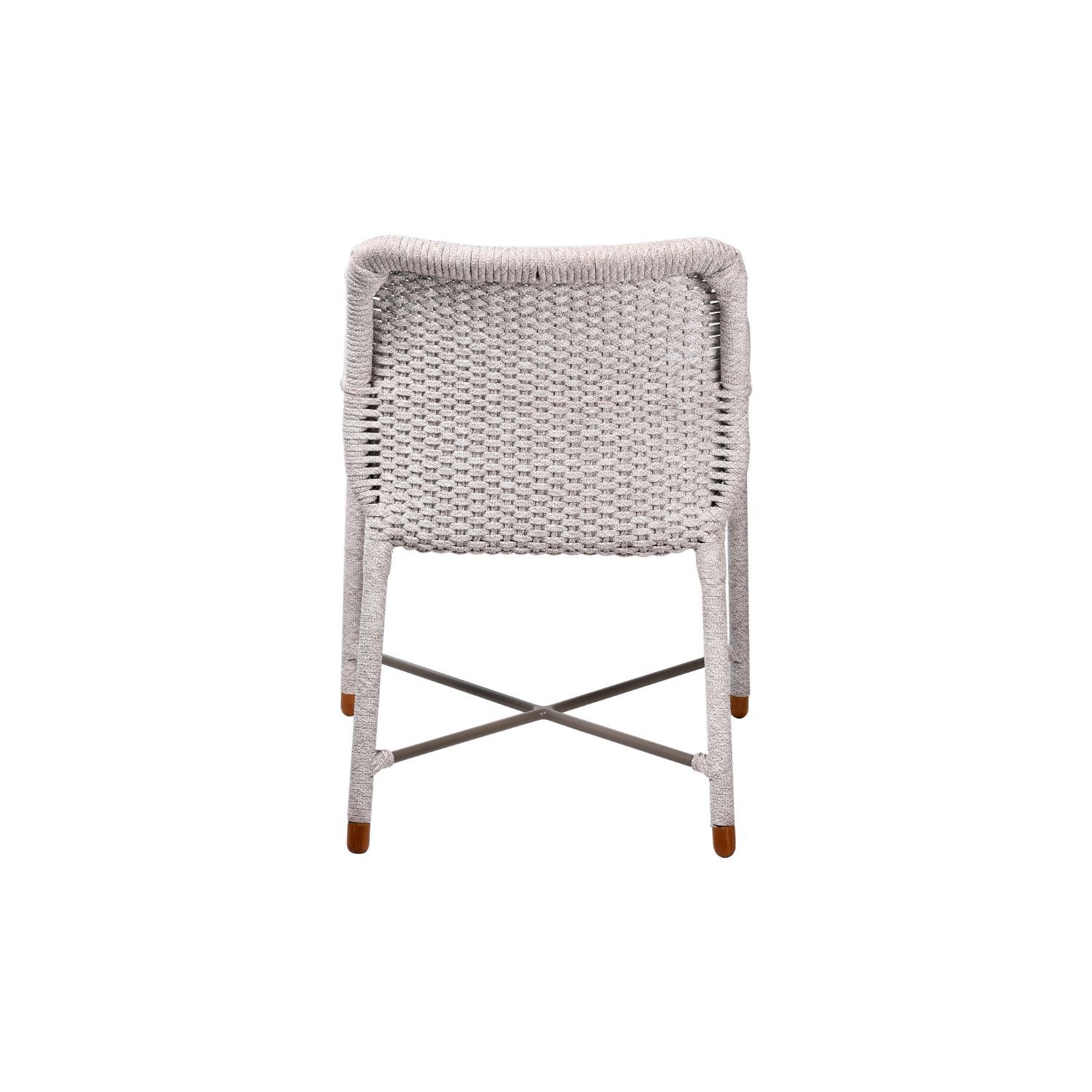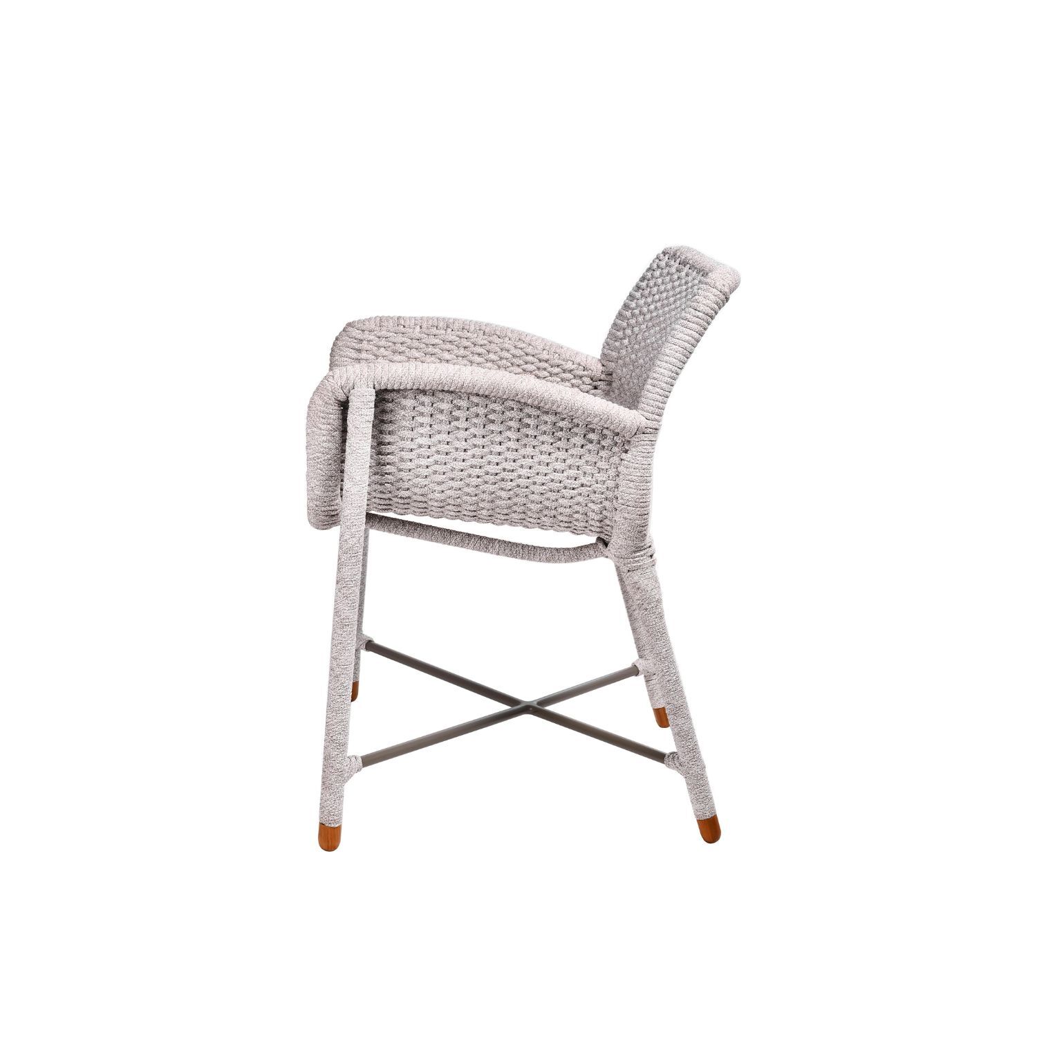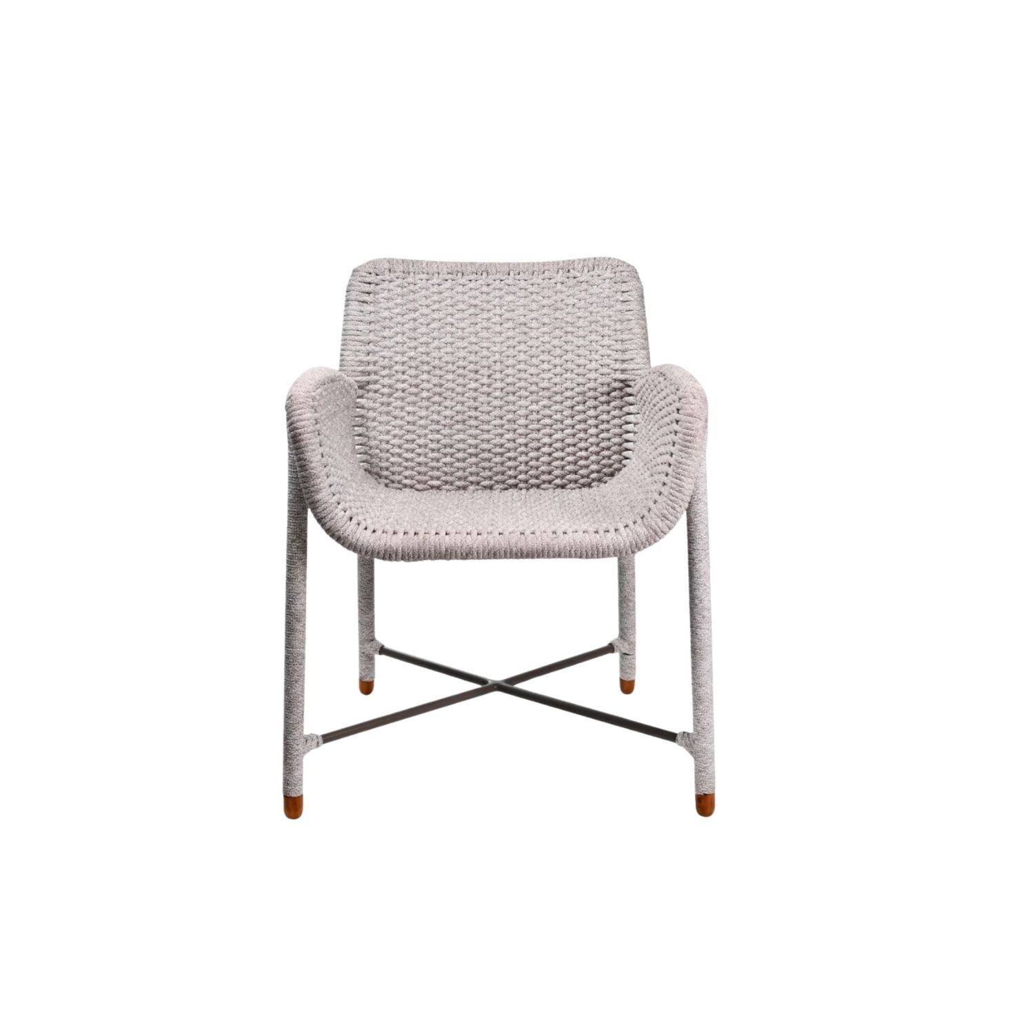 Rain Armchair brings an inviting ease to outdoor dining. Its fully woven seat and frame form a curved, organic silhouette that feels at home in any setting. Armrests offer gentle support for long conversations at the table, while teak feet ground the chair with a natural touch.