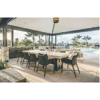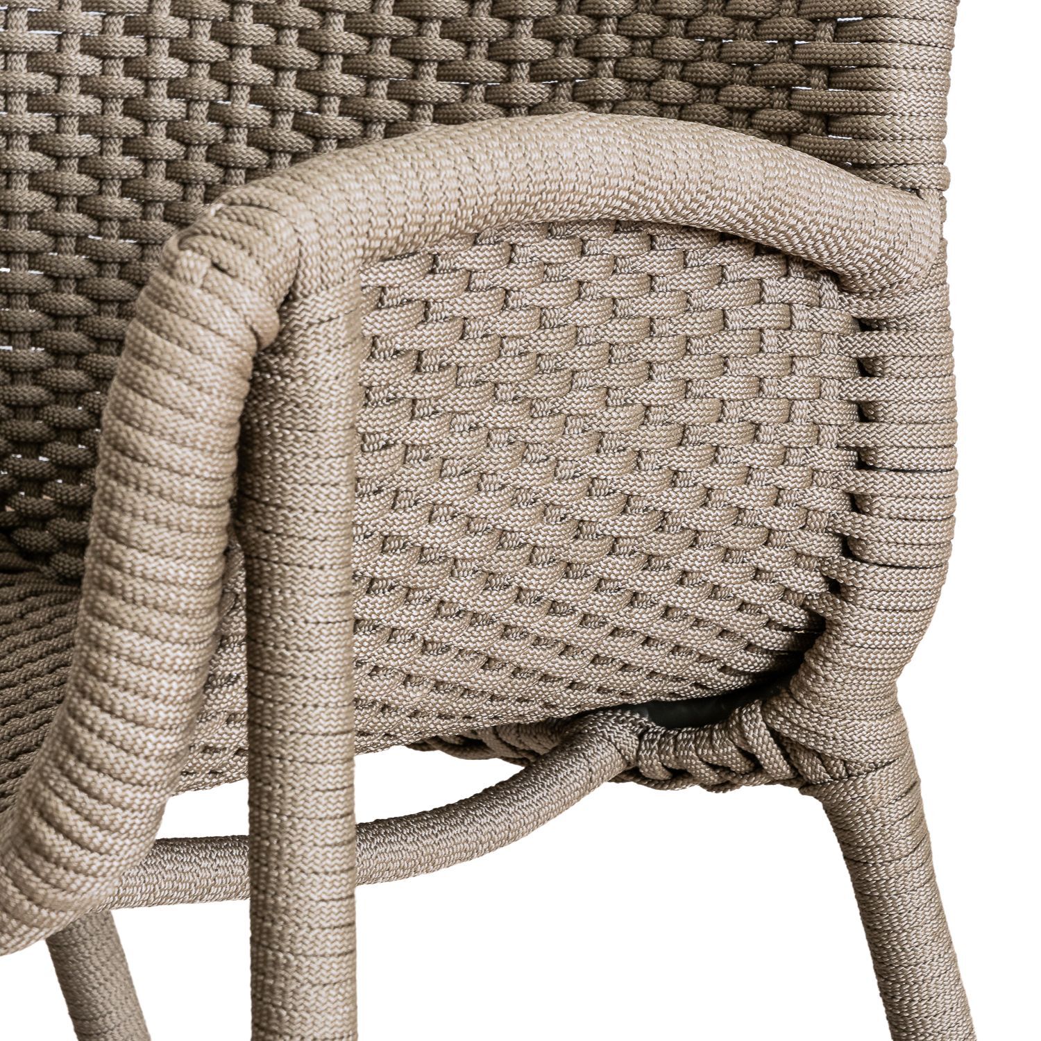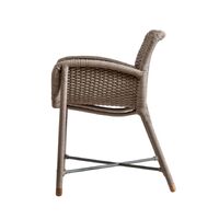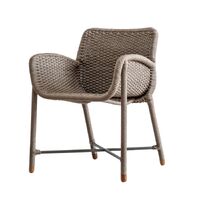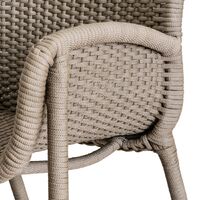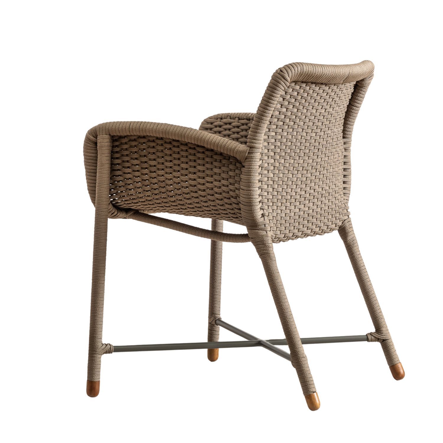 Rain Armchair brings an inviting ease to outdoor dining. Its fully woven seat and frame form a curved, organic silhouette that feels at home in any setting. Armrests offer gentle support for long conversations at the table, while teak feet ground the chair with a natural touch.