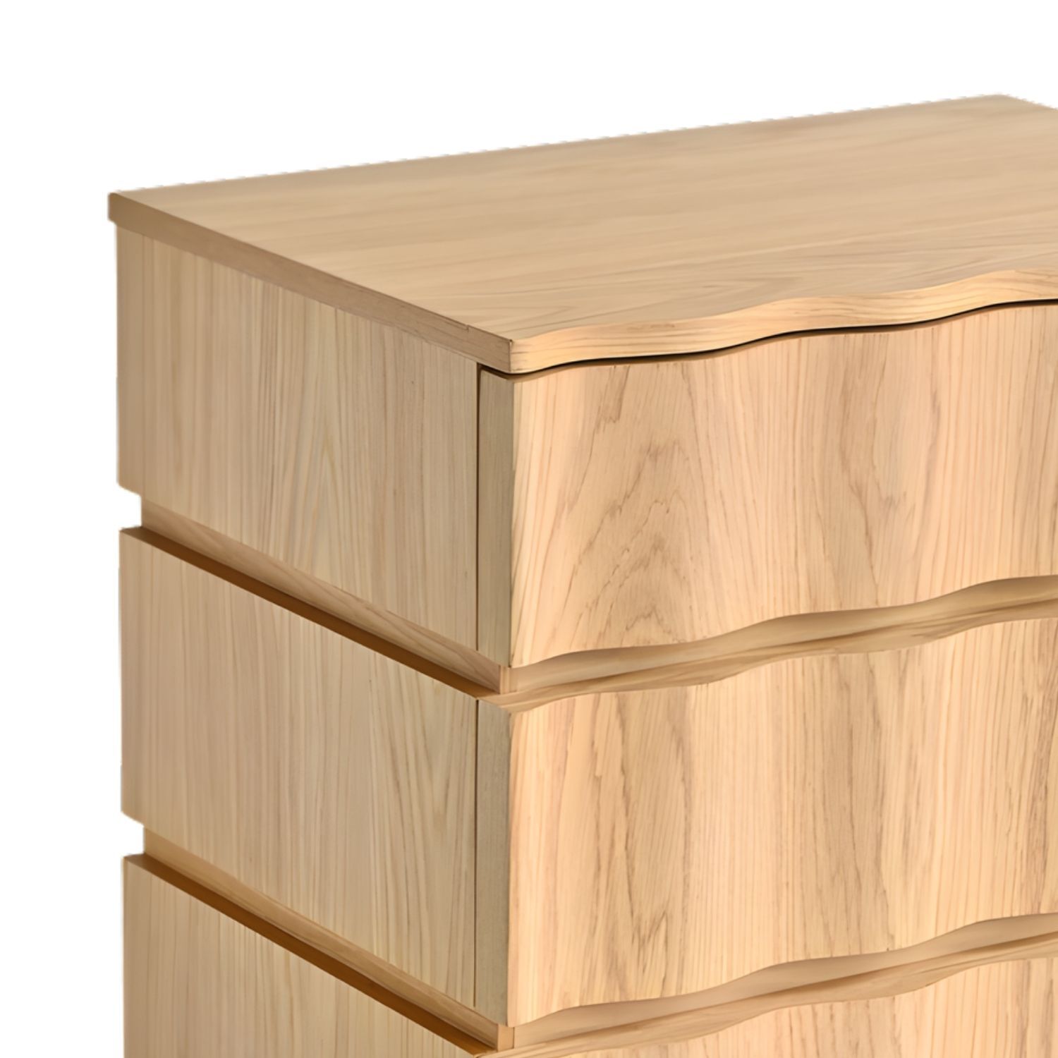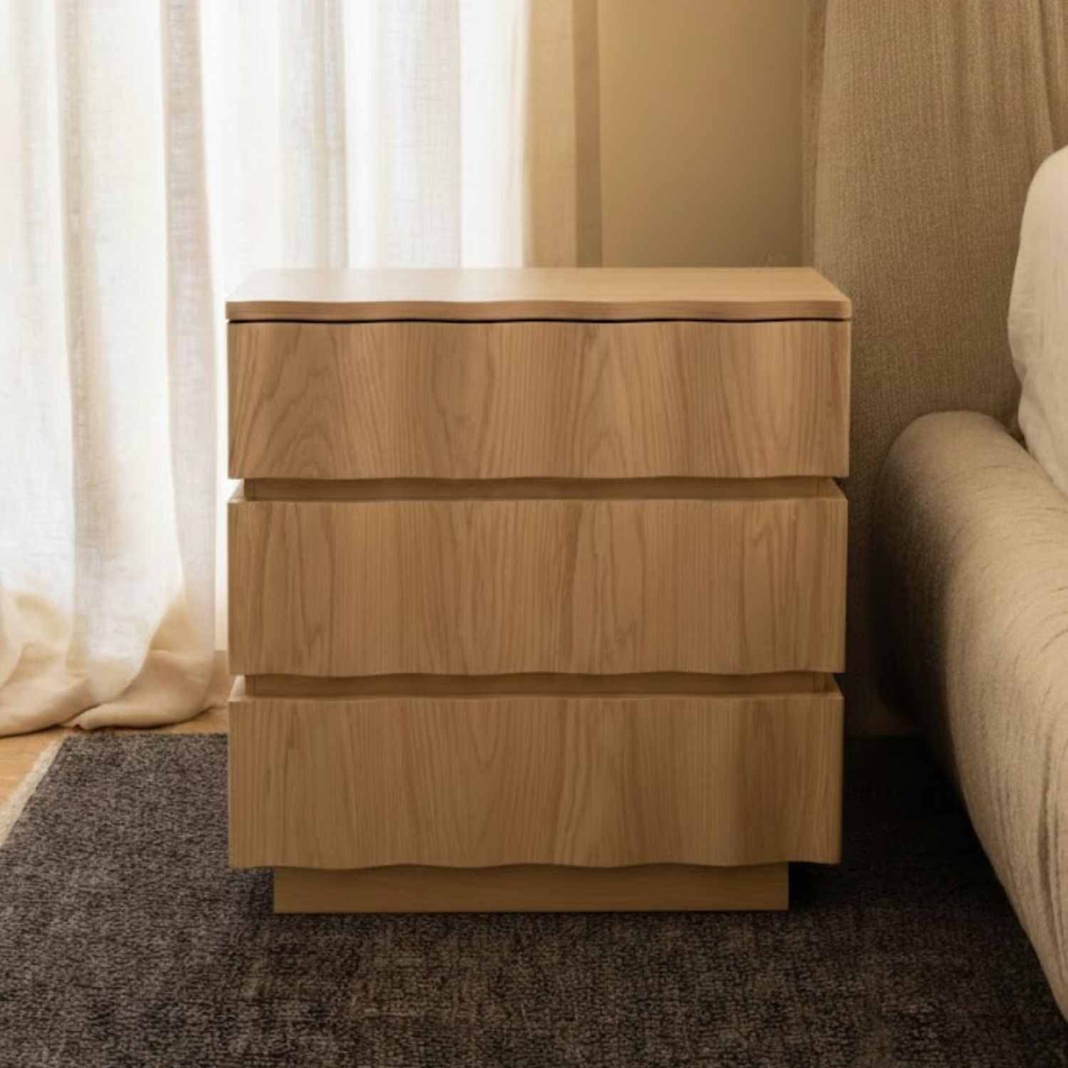 A piece born of rhythm and repetition, the Talita bedside is unmistakably distinctive. Three horizontal tiers of natural oak create a beautifully contoured form, all stacked curves and warm grain, catching the light at every angle. Open and sculptural in it's design, the Talita offers accessible, layered storage whilst doubling as a genuine design moment. It brings an organic, almost artisanal quality to the bedside, celebrating the inherent beauty of timber in its most expressive form.