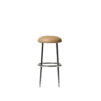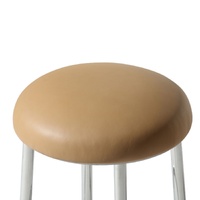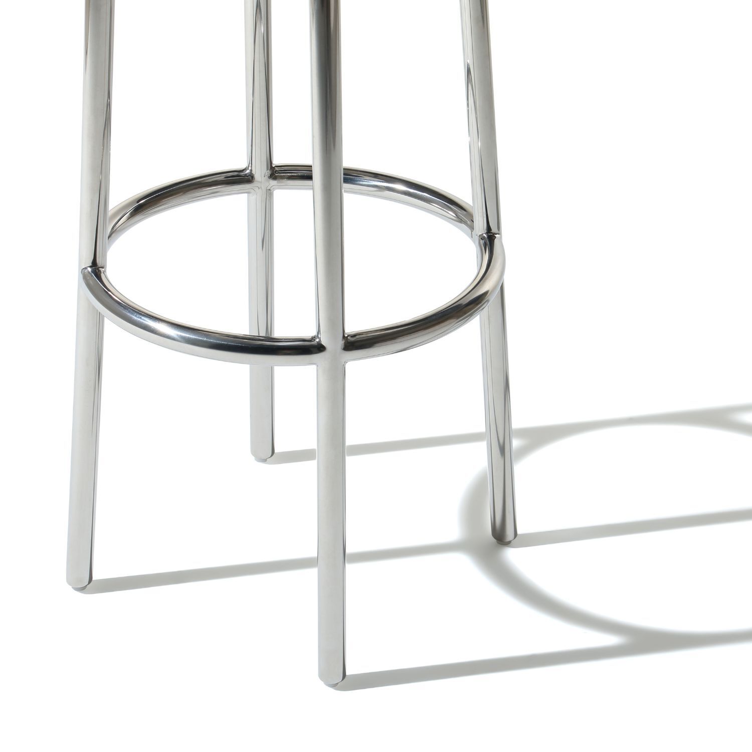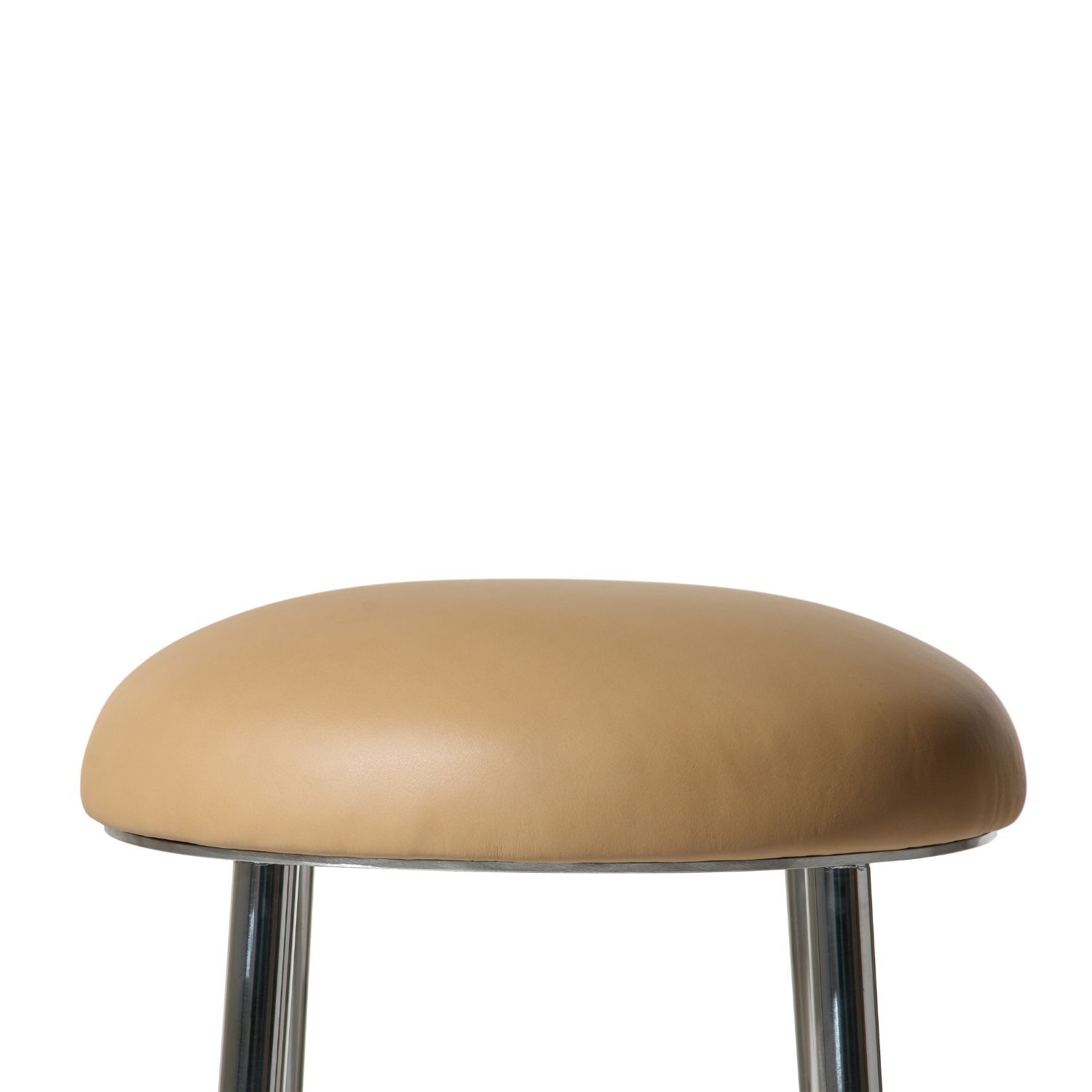 The Standard Bar Stool features a round, backless seat in soft vintage sandstone leather set atop a polished stainless steel frame. Its seamless, minimal form brings modern refinement with an industrial edge to any kitchen or bar.