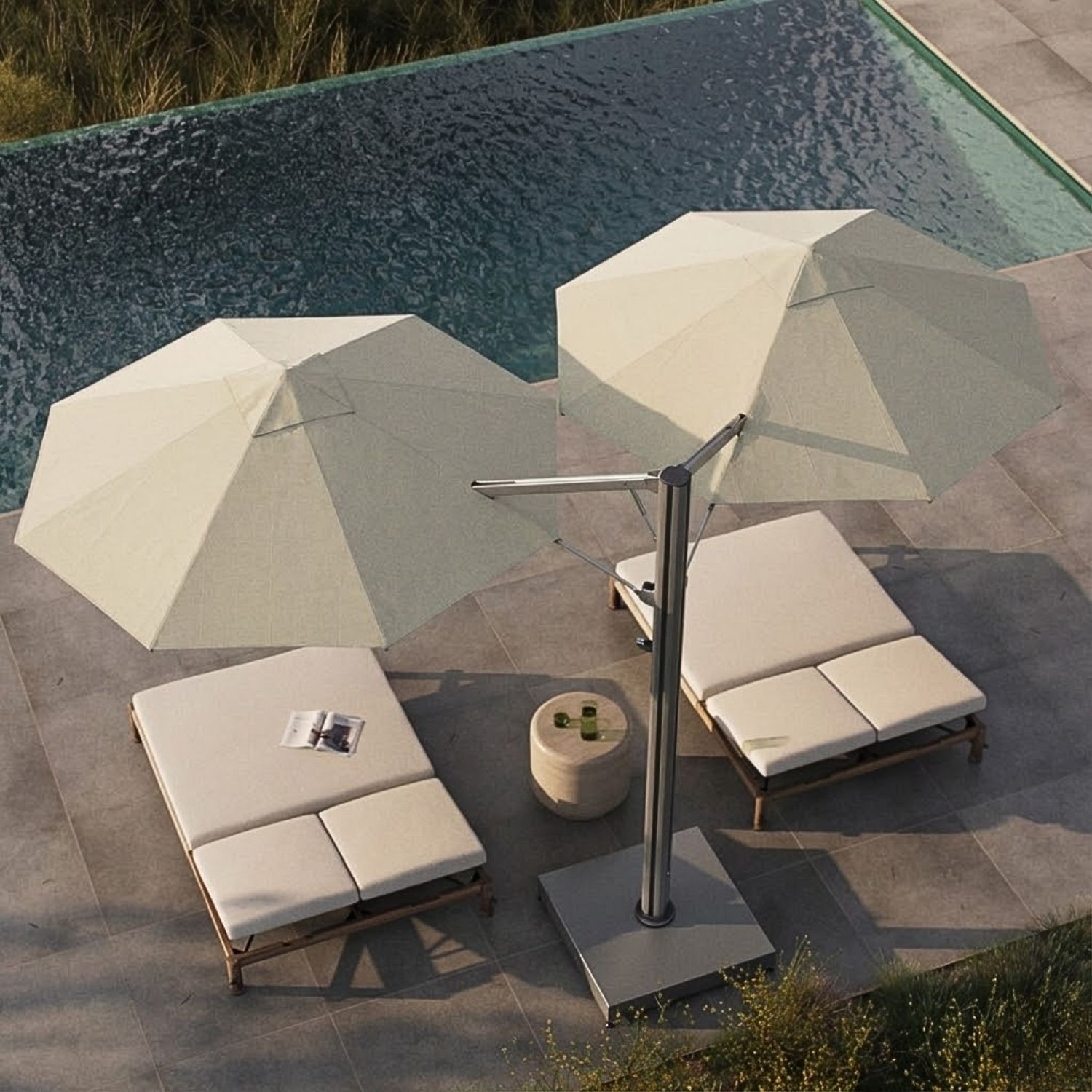 The Shadowspec Unity umbrella is a premium outdoor shade solution built with marine-grade aluminium and stainless steel to endure Australian weather. It features a modular cantilever system that can support up to four canopies from a single mast, ideal when you want versatile, large-area coverage. With the patented ShadowGlide and ShadowLift mechanisms the canopy glides open or closed smoothly with minimal effort. It rotates a full 360° and can be paired with robust mounting options so you can adjust shade exactly where you need it.